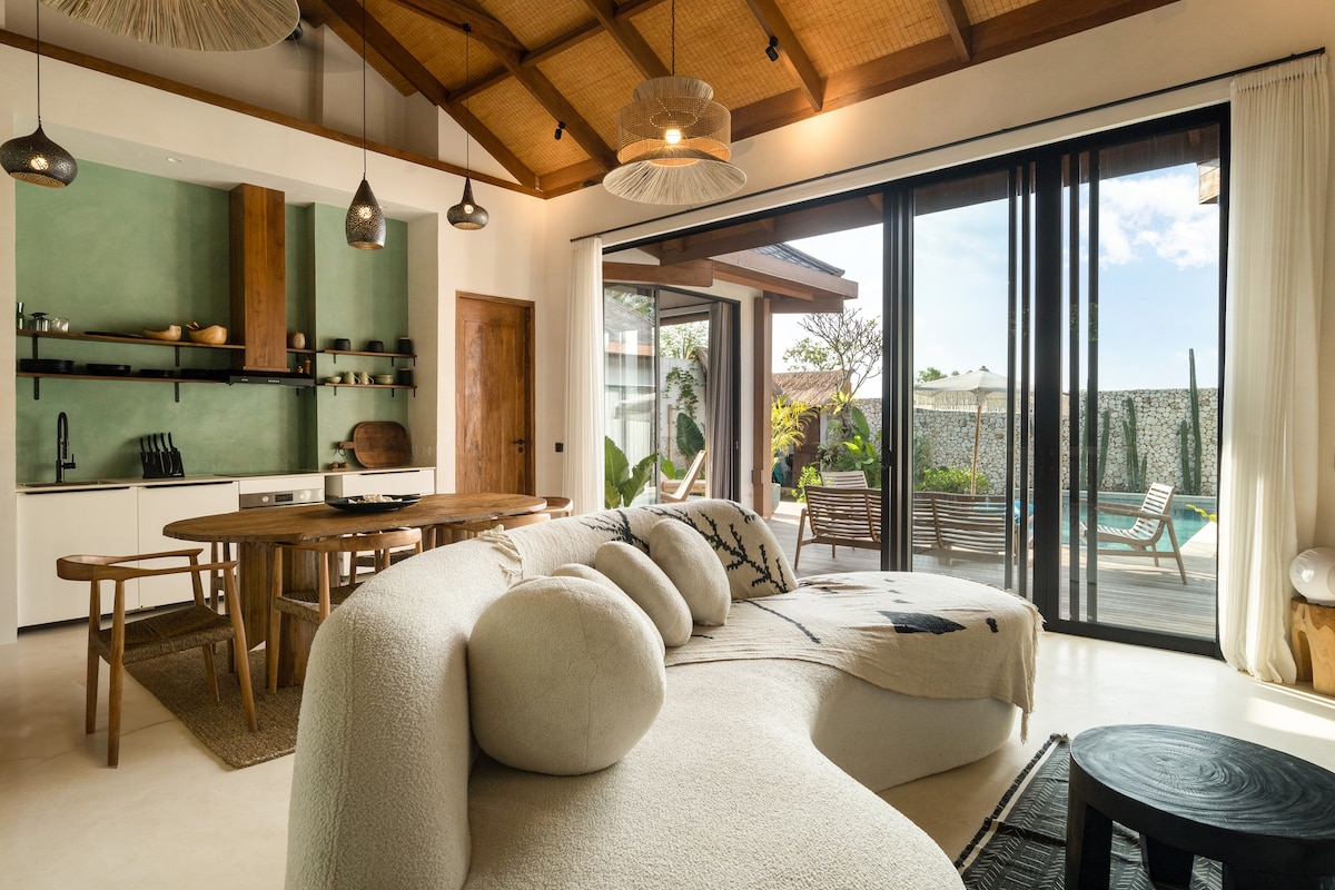 Vyraz do své soukromé tropické svatyně – navržené s ohledem na romantiku a relaxaci. Tato stylová vila s jednou ložnicí, která se nachází v klidné části Bali, kombinuje křivky inspirované Středomořím s moderní elegancí a je ideální pro páry a novomanžele, kteří hledají vysněný pobyt. Ať už se probouzíš do měkkého slunečního světla prostupujícího průsvitnými závěsy, jíš pod širým nebem pod hvězdami, nebo si užíváš relaxační koupel ve své designové sprše, každý detail byl zvolen s ohledem na pohodlí, styl a propojení.