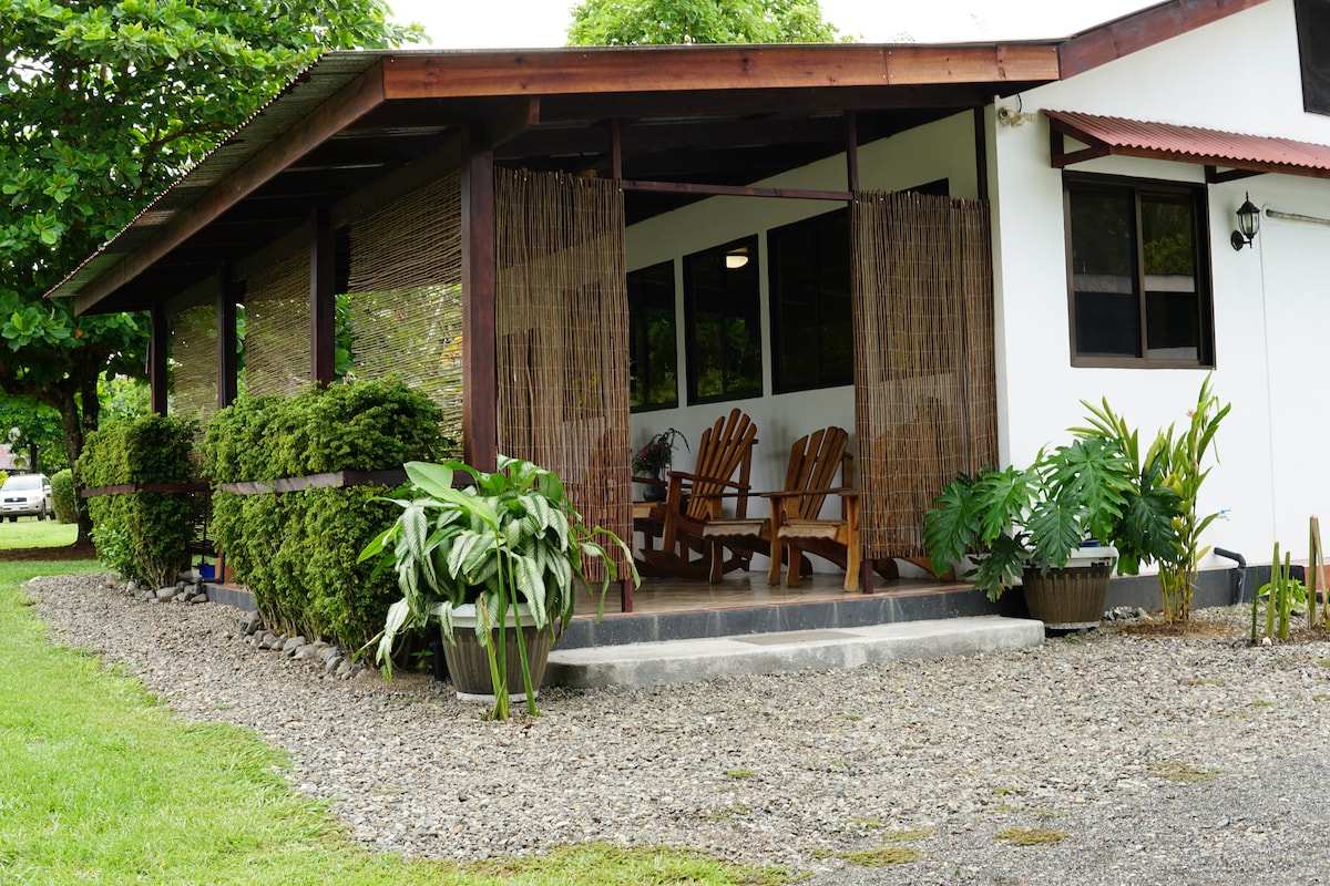 Casa del Bambu: Prostorné útočiště s manželskou postelí v ložnici, samostatným lůžkem v obývacím pokoji (další samostatné lůžko na vyžádání), klimatizací, dvěma chytrými televizory, vysokorychlostním Wi-Fi Starlink, velkou vanou s horkou sprchou a horkou vodou na každém kohoutku. Užij si vaření v plně vybavené kuchyni s krytým venkovním prostorem a odpočiň si na klidné terase uprostřed svěže upravených zahrad, jen 5 minut jízdy od Puerto Jiménez, v blízkosti pláží, restaurací, bank a veškerého občanského vybavení.