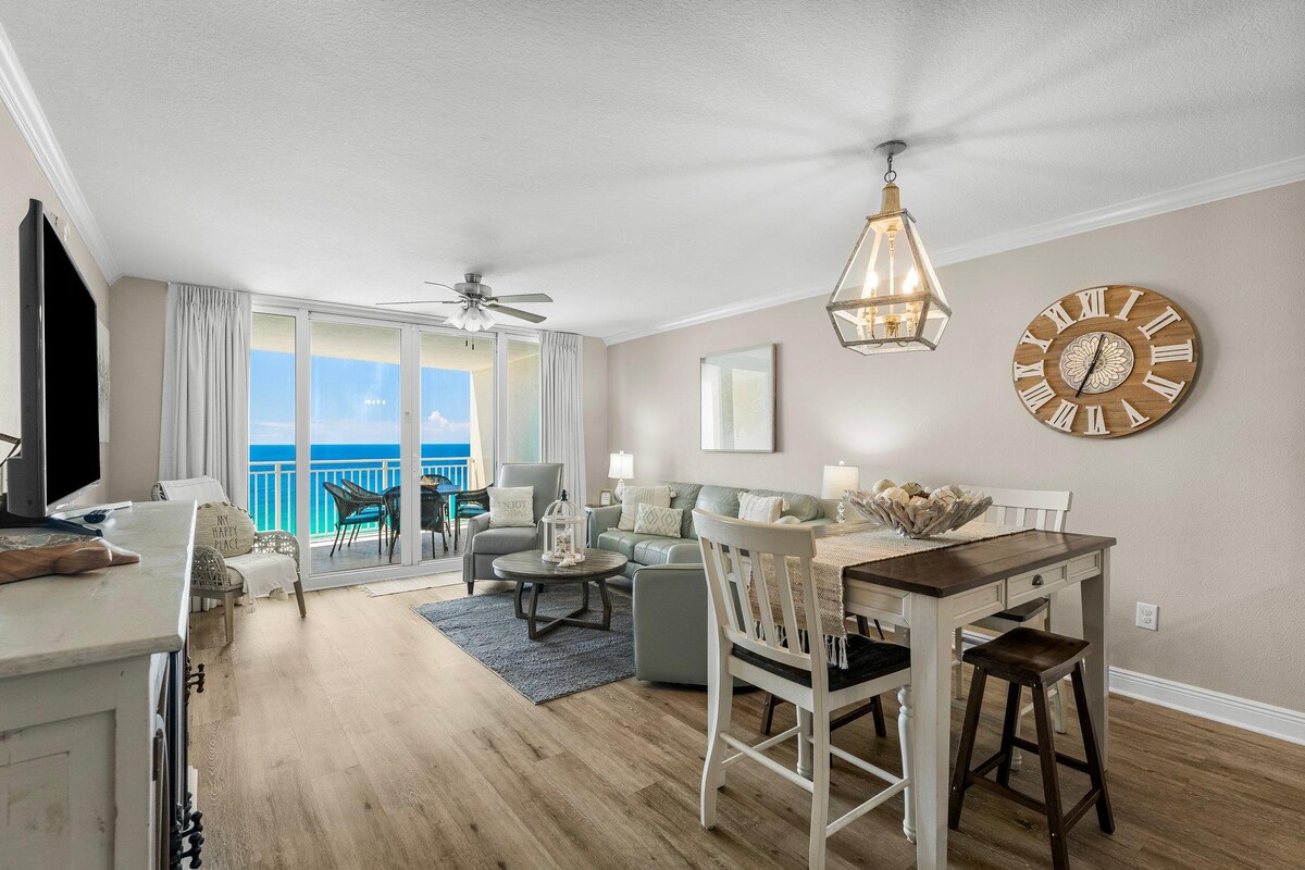 Nově zrekonstruovaný moderní luxusní byt z poloviny století s úchvatným výhledem na záliv, v docházkové vzdálenosti od Pier Park a Gulf World a spoustou vybavení, jako je vyhřívaný bazén, vířivka, posilovna a mini kino. Podívejte se na naše další nabídky pro 2BR a studio. Budova se nachází přes ulici od Sharky's. Nemovitost je přímo u pláže, ale ne na pláži.