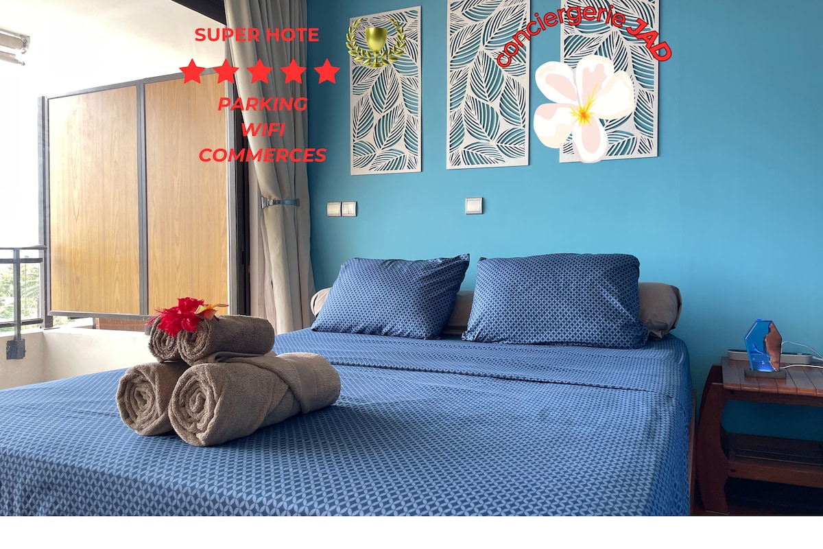 Studio Blue Moana s výhledem na moře v luxusní rezidenci s vlastním parkovištěm, terasou, bazénem, posilovnou, které se nachází v centru Papeete, 5 minut jízdy autem od trajektového přístaviště, odkud každých 50 minut odjíždí trajekty na ostrov Moorea Ideální místo pro příjemný pobyt na Tahiti. Nacházíte se 11 km od špičky Vénus (černé písečné pláže), 15 km od surfařského místa Papenoo, pěší turistika nebo 4x4 s krásnými řekami a vodopady 18 km od krásných bílých písečných pláží!