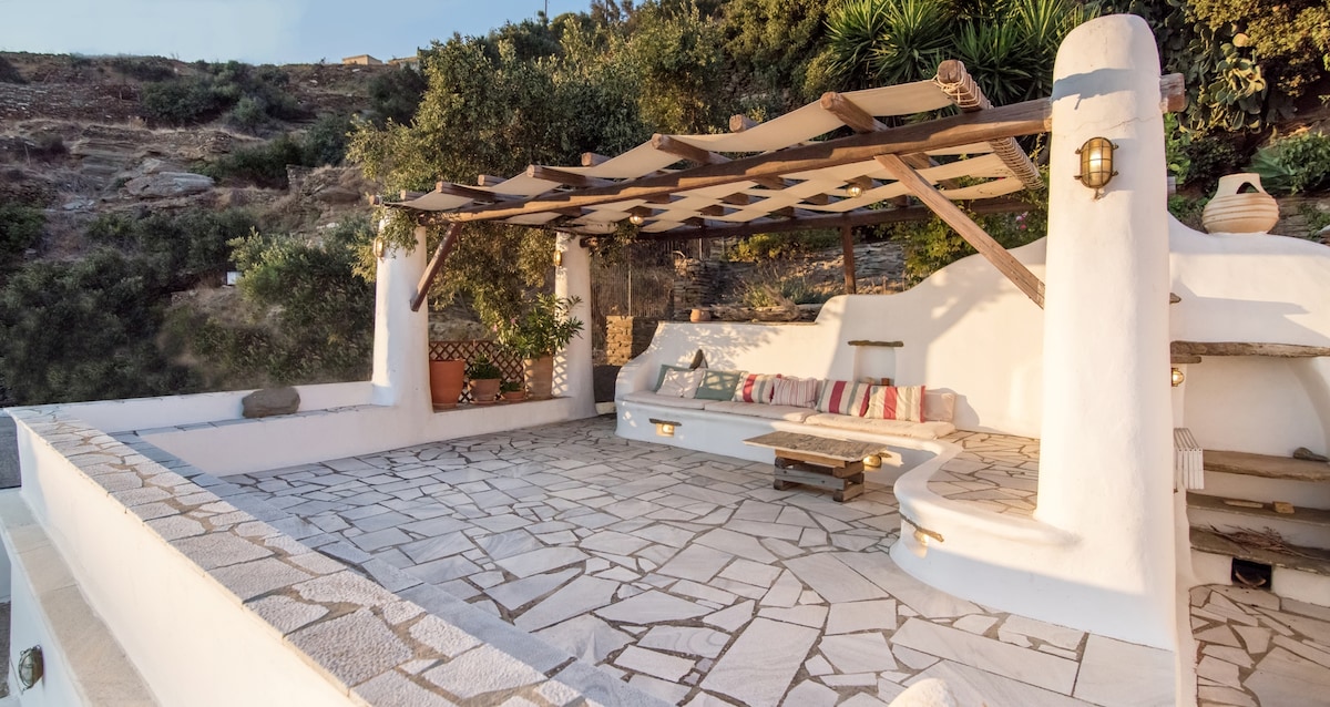 Kykladský dům s bílým a kamenným pozadím na tebe čeká v Lower Places of Tinos, kde zažije chvíle relaxace a bezstarostně. A luxury accommodation, 20’drive from the island' s capital and 10 ’from Kolymbithra, where the old and modern, traditional and modern, beauty and simplicity become one.