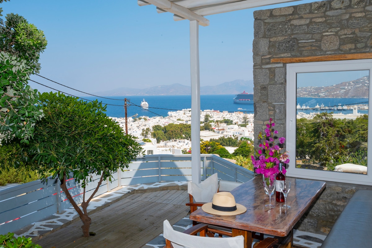 *BAZÉN JE SOUKROMÝ* Tento moderní apartmán má 2 ložnice, 2 koupelny a venkovní soukromý prostor s výjimečným výhledem na Mykonos, Středozemní moře a Kykladské ostrovy. Interiér byl právě zrekonstruován a všechno je nové. Nový apartmán se nachází 4 minuty (chůze) od města a pláže Ornos a 5 minut jízdy od města Mykonos. 2 minuty (pěšky) je autobusová zastávka, která vás zavede do města Mykonos. Denní úklid je zahrnut. Soukromý bazén s panoramatickým výhledem na moře Soukromé parkoviště