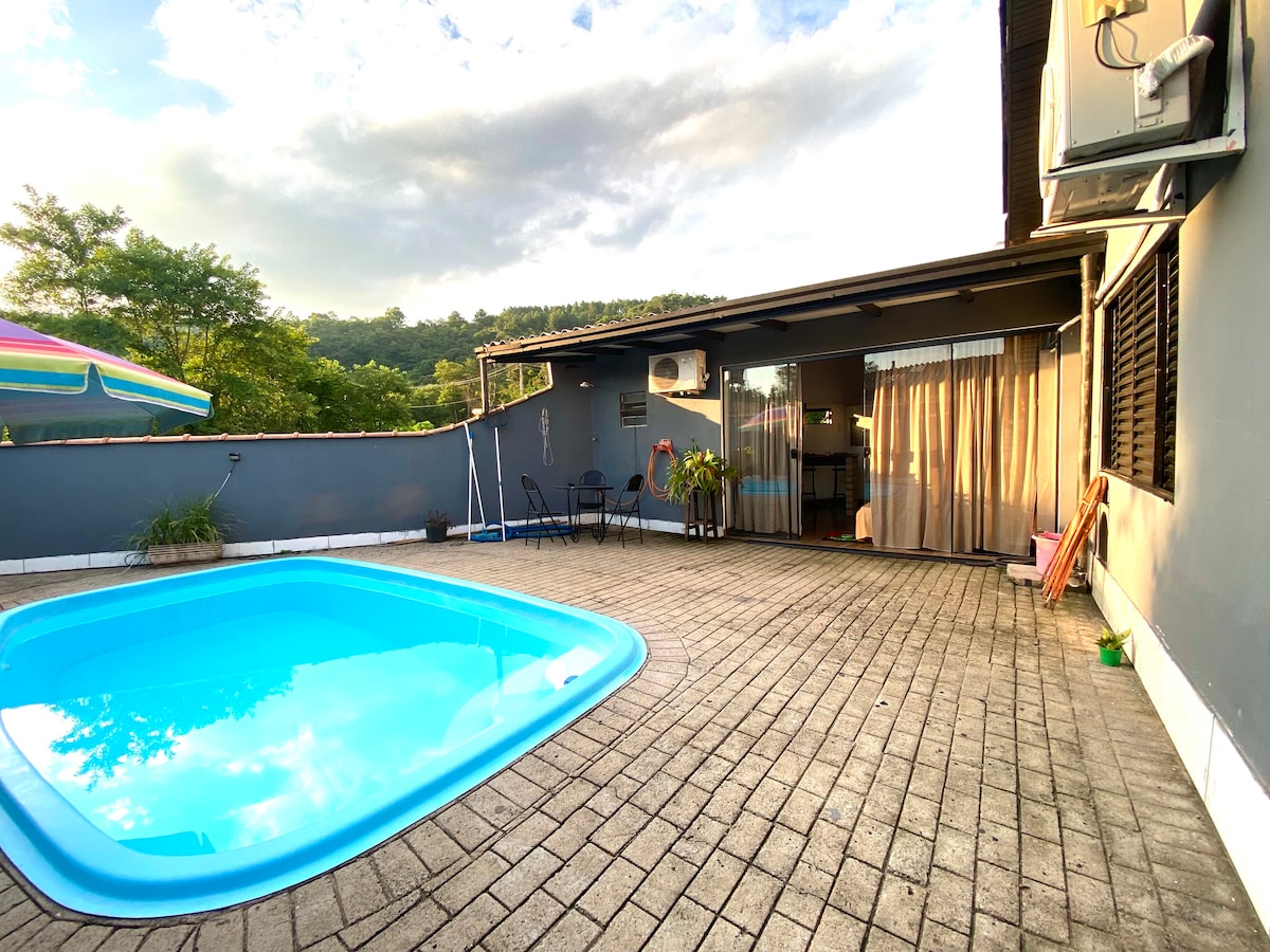Řadový dům se nachází v krásné a klidné oblasti Sapiranga, na úpatí Morro Ferrabraz, pohlednice města, kde oblohou létají závěsné kluzáky. Řadový dům je vzdálen 1,8 km od centra města Sapiranga a dálnice ERS-239, která vede do Serra Gaúcha. Je to také asi 40 km od Gramada. Místo s terasou a parkováním pro 1 auto. Plně vybavená kuchyň a gril. Cyklostezka je vzdálena 150 metrů. Stojí za to vědět, ať už jsi na služební cestě nebo na procházce!