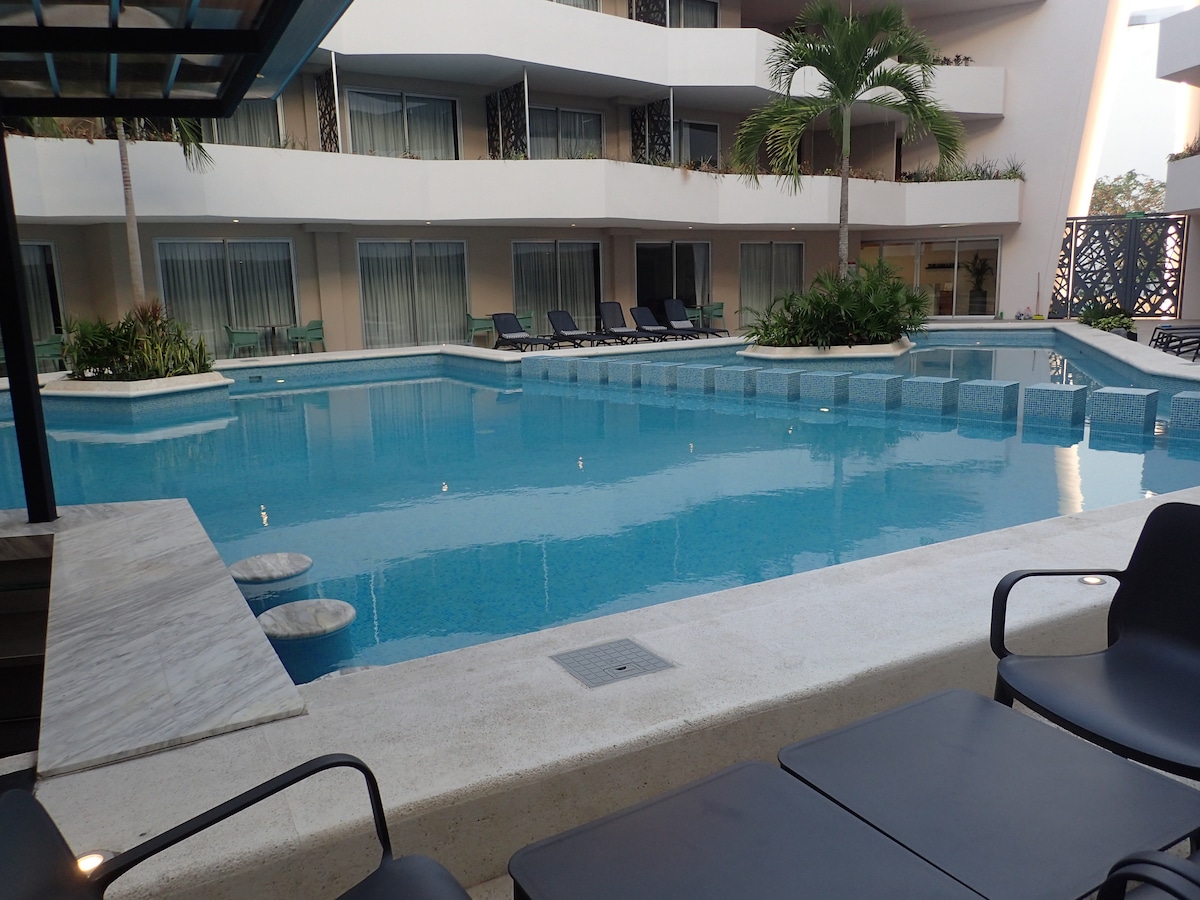 Moderní kondominium Playacar s výhledem na bazén a přírodou