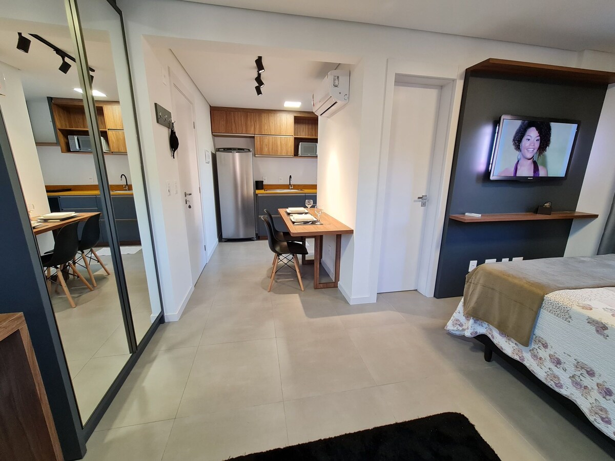 Beautiful studio apartment with garage, in the center of Blumenau, near everything! Building has a gym and an incredible rooftop pool. The apartment is complete and very stylish. Double bed, sheets, covers, pillows, bath towels, AC. Full kitchen with refrigerator, microwave and tableware for 2. Laundry with iron table and iron.