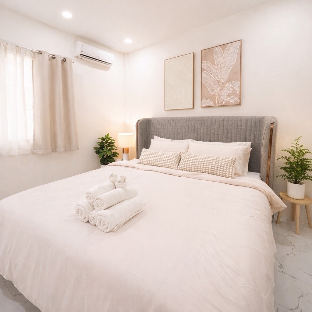 Přiveď celou rodinu do tohoto krásně navrženého domova vybaveného vším, co potřebuješ pro pohodlný a relaxační pobyt. To nejzajímavější: • Dvoupatrový samostatně stojící dům • 200 m ² obytného prostoru • Vyhrazené parkoviště. • 2 ložnice s manželskou postelí King • 2 koupelny a vířivka • Plně vybavená kuchyň • Prostorná zahrada Poblíž: • Letiště DMK (10 km) • IMPACT Arena Muang Thong Thani • MRT Dark Red Line • Golfové kluby Zajištění bezproblémového přístupu k prozkoumání Bangkoku autem nebo veřejnou dopravou.
