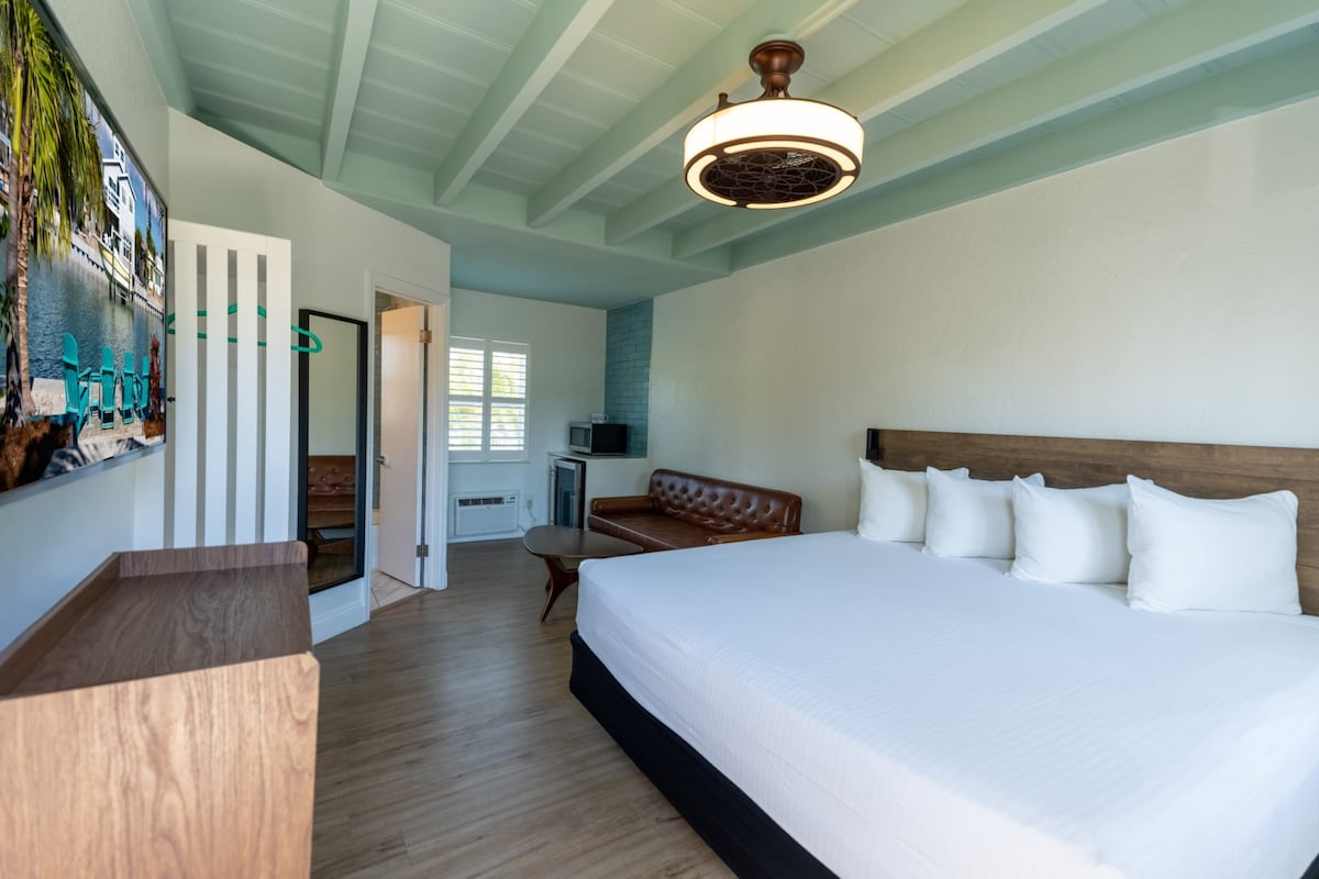 Apartmá s manželskou postelí v Las Olas – moderní pohodlí pár kroků od písku Vychutnej si slunce a odpočiň si v Las Olas na Treasure Island, butikovém pobřežním útočišti hned naproti třpytivé vodě pláže Treasure Island Beach. Klenot s 12 čistými a pohodlnými pokoji pro hosty, určenými pro milovníky pláže. Tento apartmá s manželskou postelí King je vhodný pro 4 osoby, má rozkládací pohovku Queen, kuchyňský kout a všechny nezbytnosti, díky nimž se budeš cítit jako doma. Moderní vybavení s plážovým šarmem Las Olas ~ nech se vést vlnami!