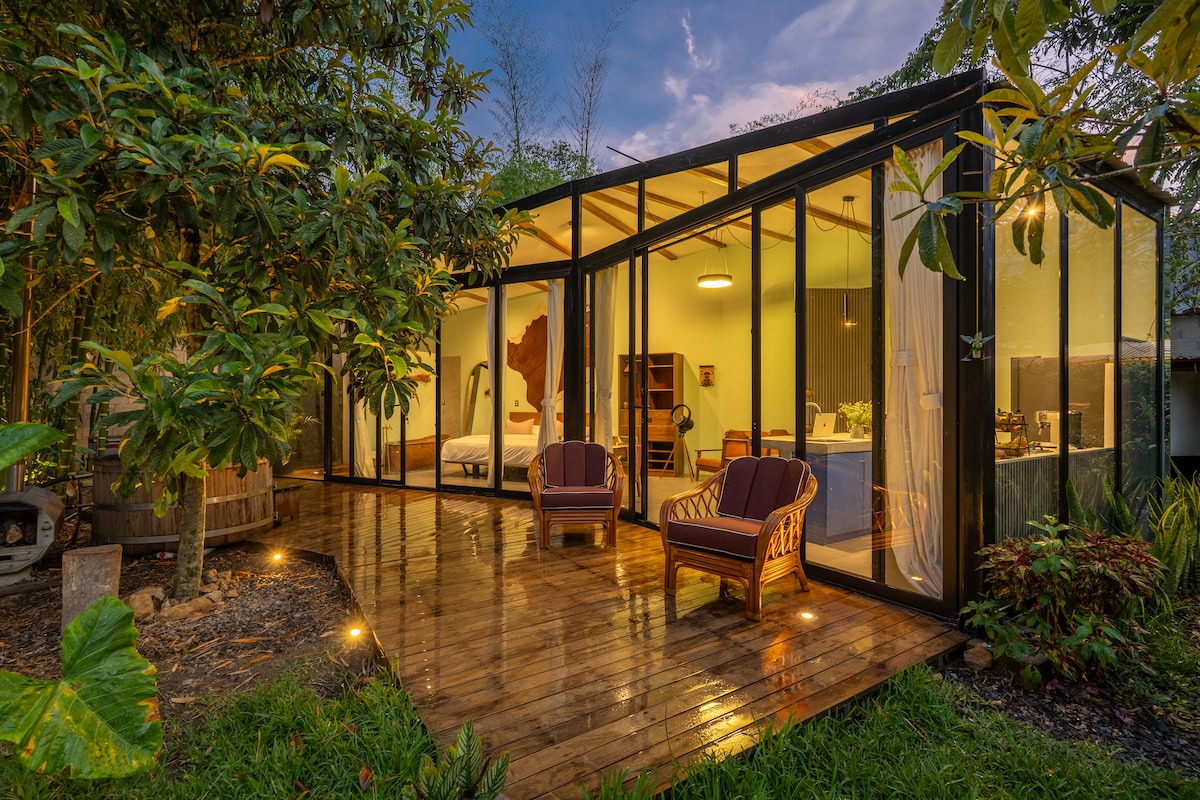 Escápate a una tiny house revestida en espejos, diseñada para reflejar la belleza viva de la selva alta a un hora de Chachapoyas. Perfecta para parejas, combina arquitectura contemporánea y naturaleza: disfruta del jacuzi del tipo hot tub con hierbas medicinales, insumos para el desayuno incluido y una combi camper lista para explorar los paisajes cercanos a Gocta, Kuelap y otros. Un refugio romántico, sostenible y lleno de calma.