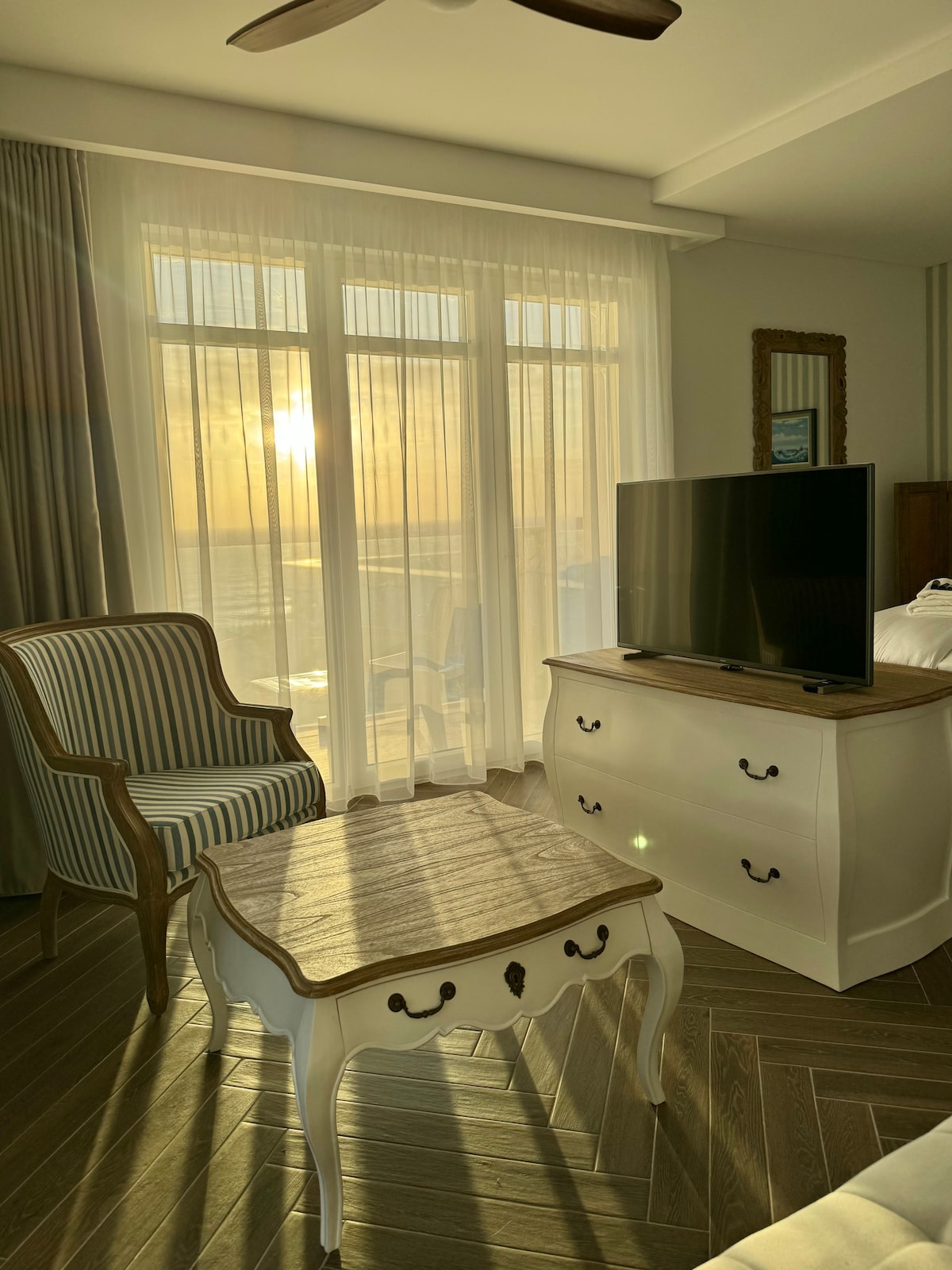 Moderně zařízený apartmán se zahradou a výhledem na rozvíjející se oblast v resortu Ocean View Apartments, který nabízí společné prostory jako recepci, lobby, bazén, fitness, gril, a parkování. Samotný apartmán je plně vybavený, včetně moderní kuchyňské linky s elektrickými spotřebiči, jako je indukční varná deska, kávovar, lednice, a nádobí. Pro vaše pohodlí a komfort je k dispozici vybavení, jako je chytrá TV s Wi-Fi, klimatizace, bezpečnostní systém a trezor.