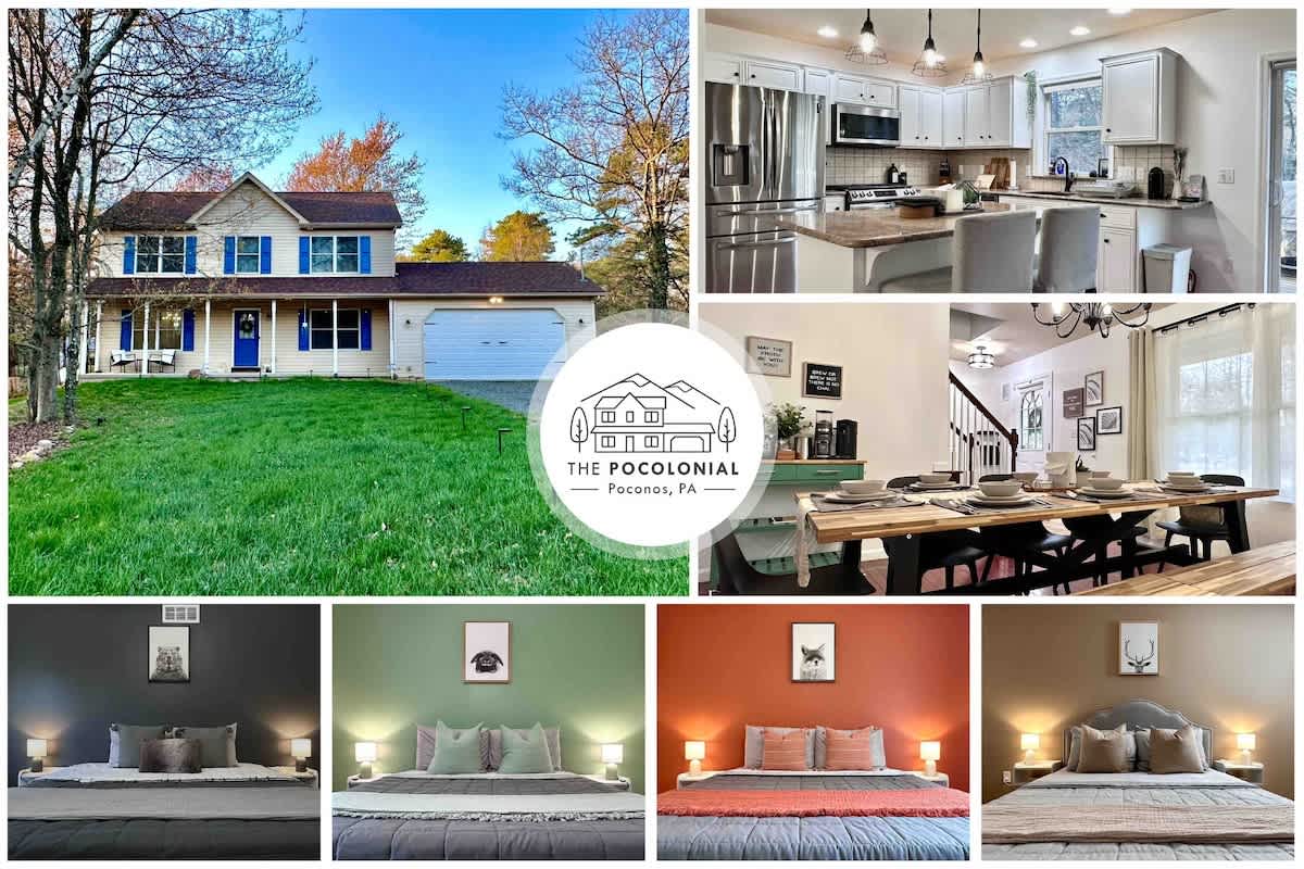Welcome to Poconoland! Jessica & Scott can't wait to host your mountain adventures. 🌲 Private Saltwater Pool | Open Memorial Day - Labor Day 🌲 Stylish Mountain Maximalism Decor 🌲 Private Hot Tub 🌲 Pet Friendly - Bring Your Furry Friends 🌲 Fire Pit & indoor Gas fireplace 🌲 Smart TVs with Disney+, Hulu & Netflix 🌲 Family friendly game room with Nintendo Switch, Games & Toys 🌲 Minutes to skiing and hiking 🌲 Huge backyard with lawn games & bounce house