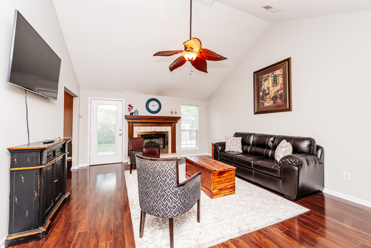 Tato vybraná sbírka moderního statku je tvým nezbytným pobytem ve střední Georgii. Vysoké stropy katedrál, podlahy z tvrdého dřeva a veškerý nový nábytek dělají z Green Meadow stylový pobyt. Minutes to Rigby's Water Park, Robins AFB, Historic Downtown Macon, and the Georgia National Fairgrounds! The 2 queen beds and 2 full bathroom plus a laundry room make for a easy family stay. The 12x26 feet inground pool (open May until October 1st)