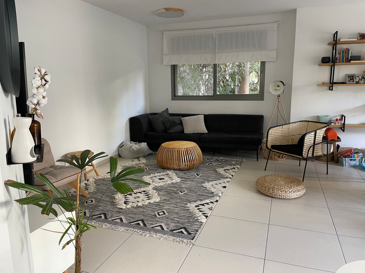 Spacious, colorfull, with a lot of light, in a quite but close to the city suberb. large living room and kitchen with dining area. front and back yards with sitting areas. free parking in the street. 20 min from tel aviv and the airport.