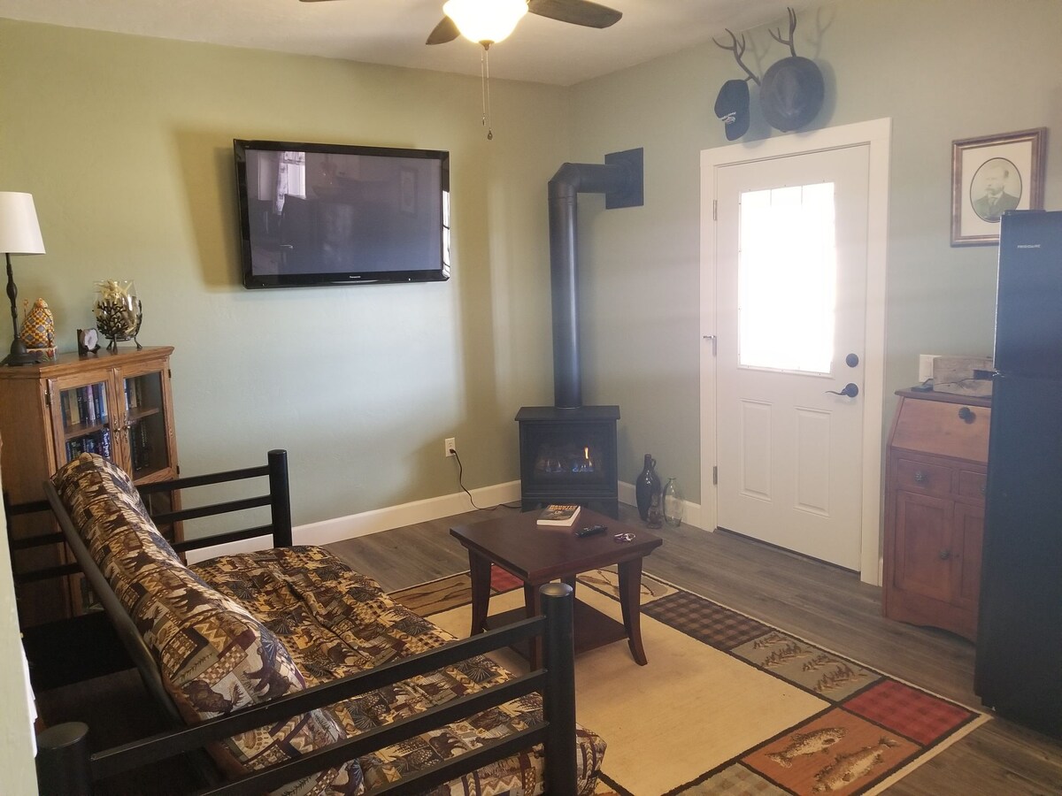 Tato útulná chalupa pro hosty se nachází tři bloky od centra města. Jednotka je oddělena od hlavní budovy a přístupná z uličky sousedící s garáží. Chata má oddělené parkoviště a krásný výhled. Tento prostor o rozloze přibližně 140 čtverečních stop zahrnuje koupelnu s umyvadlem (bez sprchy/vany), mikrovlnnou troubu, lednici, rychlovarnou konvici, psací stůl a manželskou postel. Chytrá televize/wifi a bluetooth reproduktor. Cenově dostupná a pohodlná možnost pro sólo cestovatele nebo páry, které potřebují jen dobré místo k přespání. Nová okenní klimatizace v roce 2025.