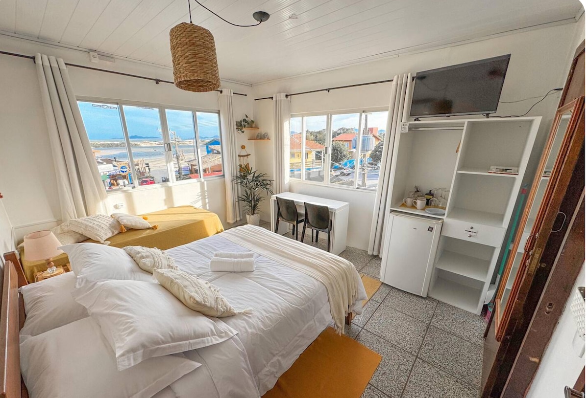 Aproveite sua sacada privativa com mesa e cadeiras para contemplar a beleza da baía de Pântano do Sul. A suíte conta com: - Banheiro privativo - Ar-condicionado - Frigobar - TV - Wifi.