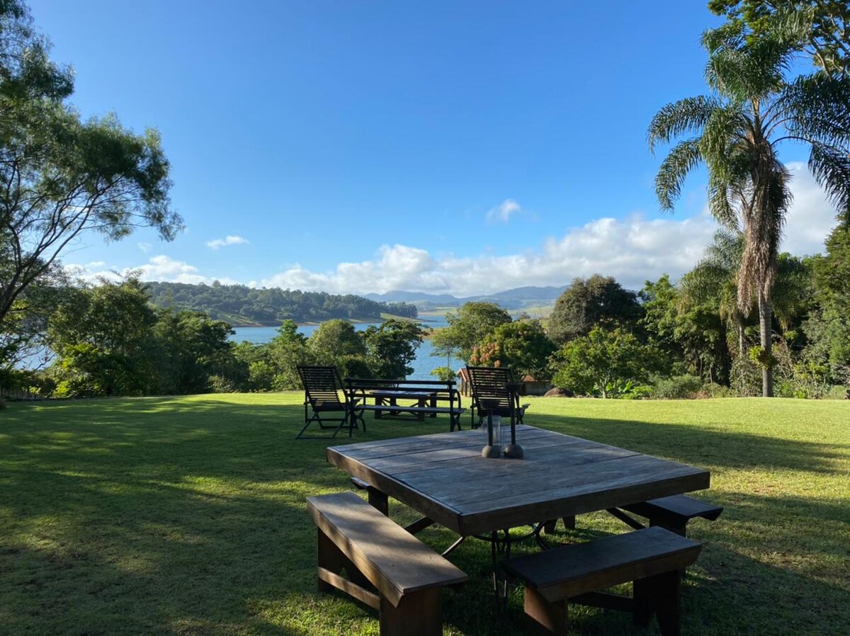 Casa do Lago em arquitetura contemporânea é literalmente sobre um lago numa pequena fazenda na beira de uma represa. Duas suítes c/ ar condicionado, banheiros c/ vista para o lago, bancada de cozinha c/ utensílios diferenciados e uma boa churrasqueira portátil. Quadra de Beach Tennis, prancha de Stand Up, 4 caiaques e 4 bikes antiguinhas. Amplo pier na represa, prainha no lago, redário, local para fogueira, cachoeirinha, trilhas, grande reflorestamento, mesas ao ar livre. Wi-Fi, SmartTV e Alexa.