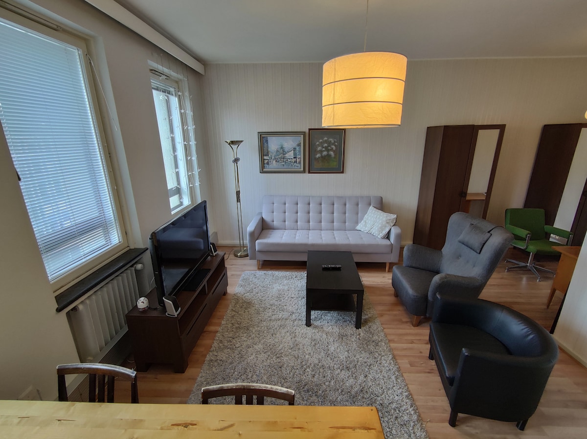 Our comfortable one/two bed room apartment has beds for four adults. It is centrally located on the main street, but at top (7th) floor city life does not disturb you. Pěší vzdálenost ke všem atrakcím Tampere. Klimatizace. Bydlím ve vedlejším domě, takže pokud je něco, mohu ti snadno pomoci.