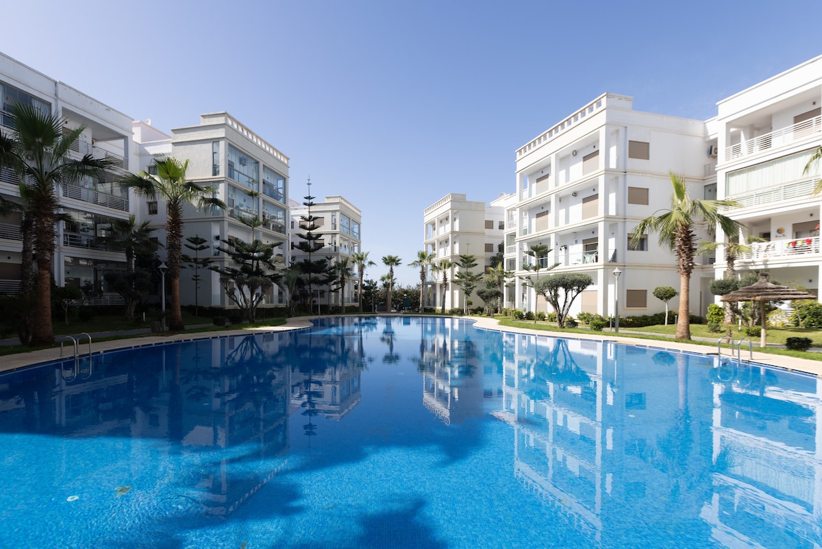 - Ideální poloha: Mezi Casablancou a Rabatem, 5 minut od pláže a 10 minut od vlakového nádraží. - Moderní prostory: Pohodlný obývací pokoj s TV, 2 ložnice (1x manželská postel a 2x samostatná lůžka) a dobře vybavená kuchyně. - Příjemný výhled: Soukromý balkon s výhledem na bazén, ideální pro relaxaci. - Vybavení: přístup do společného bazénu, bezplatné Wi-Fi 200 Mbps a zabezpečené parkoviště. - Klidná rezidence: 24hodinová ostraha pro klidný pobyt.