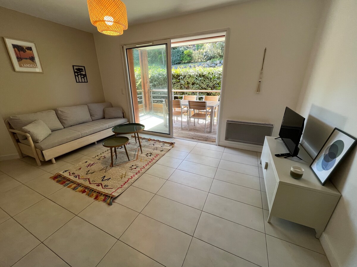 Apartmán v zahradě, v přízemí naší vily, velmi klidná oblast za dunou Santocha, 2 minuty chůze od pláží Capbreton a surfařských míst. Vstup s lodžií, vybavená kuchyň otevřená do obývacího pokoje TV manželská postel 160 cm, kabina ložnice 2 samostatné postele, koupelna, samostatné WC. Zahradní zahrada se zahradním nábytkem, jídelním stolem. Free WIFI Povinné ložní prádlo a úklidový balíček se platí na místě při příjezdu: 20 EUR/pobyt