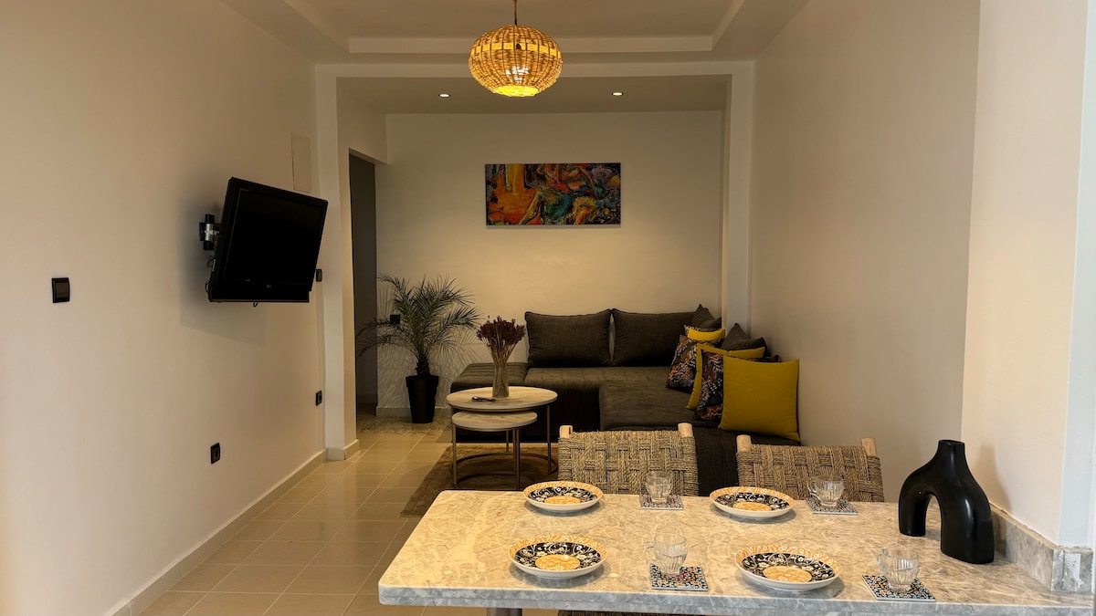 Appartement Élégant avec Terrasse Bienvenue dans ce magnifique appartement alliant modernité et confort, idéalement conçu pour un séjour relaxant. Situé au rez-de-chaussée, ce logement lumineux et spacieux Il se trouve à seulement 5 minutes en voiture de la plage, le centre commercial Carrefour est à 3 minutes à pied Que vous soyez en couple, en famille ou entre amis, cet appartement vous garantit un séjour agréable. Pour les couples marocains, il est important de présenter un acte de mariage.