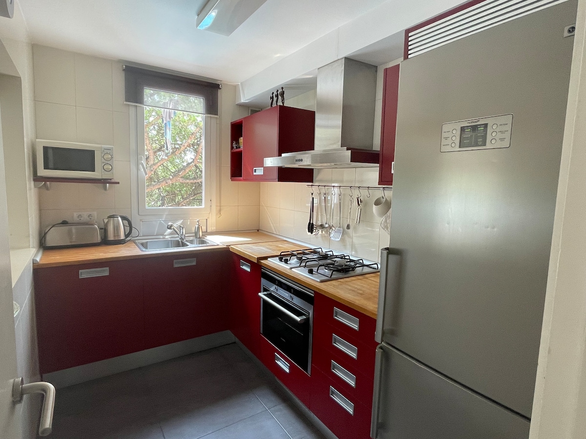 Velký apartmán o rozloze 110 m, přímo u moře, na pláži, s velkou terasou a soukromým parkovištěm. Velkolepé výhledy (jídelna s velkými okny) a 2 BAZÉNY (otevřeno od 10 do 23, červen/září) se zahradní částí (velmi dobře udržovaná), 3 pokoje s výhledem na moře a velká zahradní část. Dvě koupelny s vanou. 45 minut od Barcelony a 30 minut od letiště v Gironě. Velmi dobře vybavené, s klimatizací a topením. Zahrady a dětské hřiště vedle nemovitosti.
