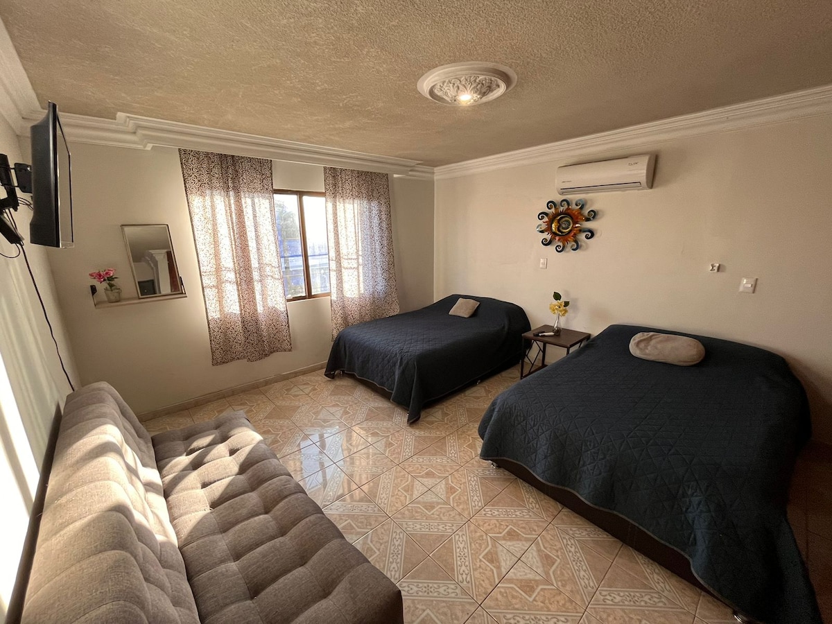 Enjoy your visit to the port of Mazatlan stay in apartment located A FEW STEPS from the BEACH , located in the Claussen Paseo area very close to the historic center and the majestic Carnival area, you will have a memorable stay when you stay in this unique place. Apartmán má ložnici se 2 manželskými postelemi Queen, prostornou rozkládací pohovku s přistýlkou pod pohovkou