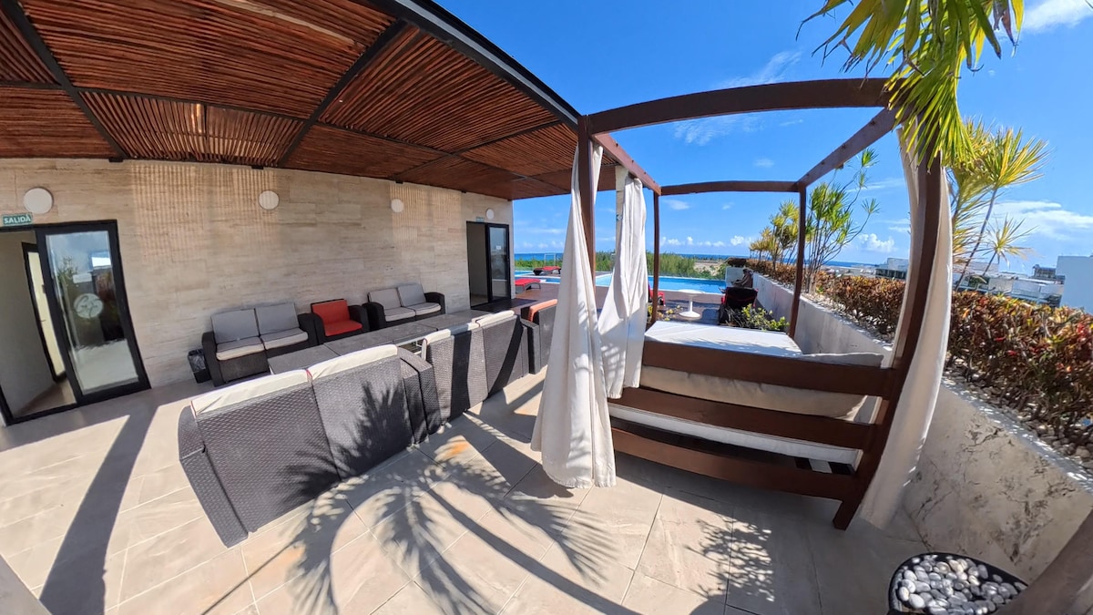 Hlavní apartmá s panoramatickým výhledem na Karibské moře a soukromou střechou s bazénem, dvěma salonky, obývacím pokojem a sprchou. Má velkou manželskou postel, rozkládací pohovku a balkon s výhledem na pláž, videoprojektor s streamovacími aplikacemi a ozvučením. Má moderní kuchyň s elektrickým sporákem, lednicí, toustovačem, kávovarem a rychlovarnou konvicí, s nabídkou čajů a kávy. Zahrnuté vybavení, jako je wifi zdarma, plážové osušky, fén, fén, trezor.