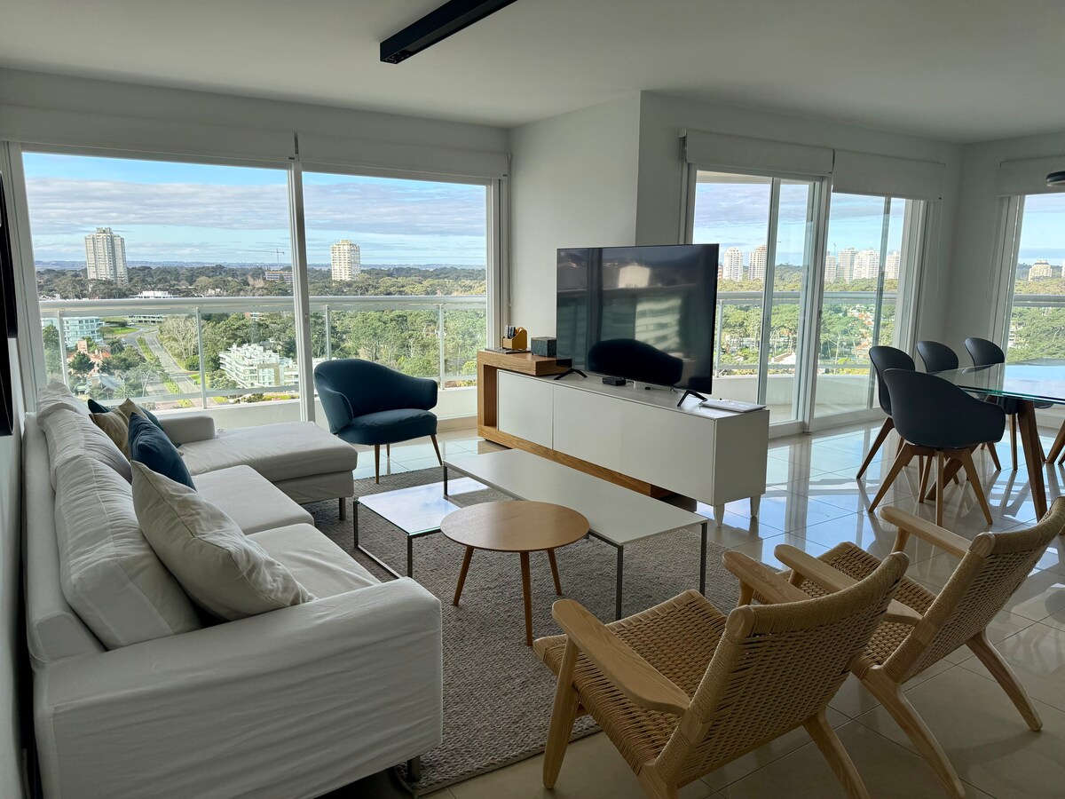 Moderní apartmán pro 2 osoby plně vybavený nádherným výhledem na moře a poloostrov se 2 balkony, který se nachází jen pár bloků od centra a pláží mansa a brava. Zahrnuje vlastní garáž, vysoce kvalitní vybavení, jako je vnitřní a venkovní bazén, sauna, posilovna, obchodní salonek a recepce s nepřetržitým provozem. Ideální pro relaxaci a vychutnání si Punta del Este po celý rok nebo kombinovat odpočinek a práci, protože má rychlé připojení k internetu (200 Mb/s).