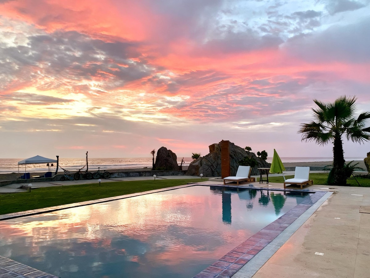 🌊 Krásný dům v první linii u oceánu s přímým přístupem na pláž a velkolepým výhledem. Ideální pro dovolenou ve dvou, s rodinou nebo s přáteli. K dispozici je pět ložnic, čtyři koupelny, soukromý bazén, gril, hliněná pec a internet Starlink. Vynikající poloha: 5 minut od mola a restaurací Cerro Azul (20 minut chůze po písku), 15 minut od Asie a 1 hodinu od Lunahuaná. Prostorné a dokonalé prostory pro odpočinek a společné bydlení.