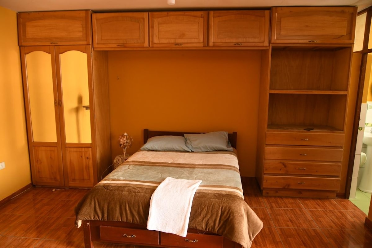 Pokoj se nachází uvnitř krásného domu centrální konstrukce v Cajamarca. Má 2 postele s kapacitou až 4 osoby, koupelnu, kabelovou televizi, teplou vodu. Nemovitost se nachází pouhých 5 minut od historického centra karnevalového hlavního města Peru. Pokud hledáš klidné a útulné místo během karnevalu v roce 2025, může to být perfektní volba.