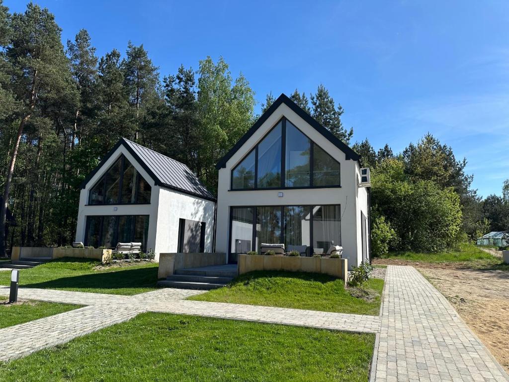 Miejsce na pobyt i odpoczynek dla rodziny lub dla par. Całoroczny domek w stylu nowoczesnej stodoły z dwiema sypialniami, w pełni wyposażoną kuchnia i kominkiem. Do domku przynależy działka Ok 1000 m z miejscem na ognisko oraz wielki taras z podgrzewanym jacuzzi. Nieopodal nad rzeka znajduje się dzika sauna opalana przez piec na drewno. Dla gości dostepna jest plaża, deska sup, kajaki.