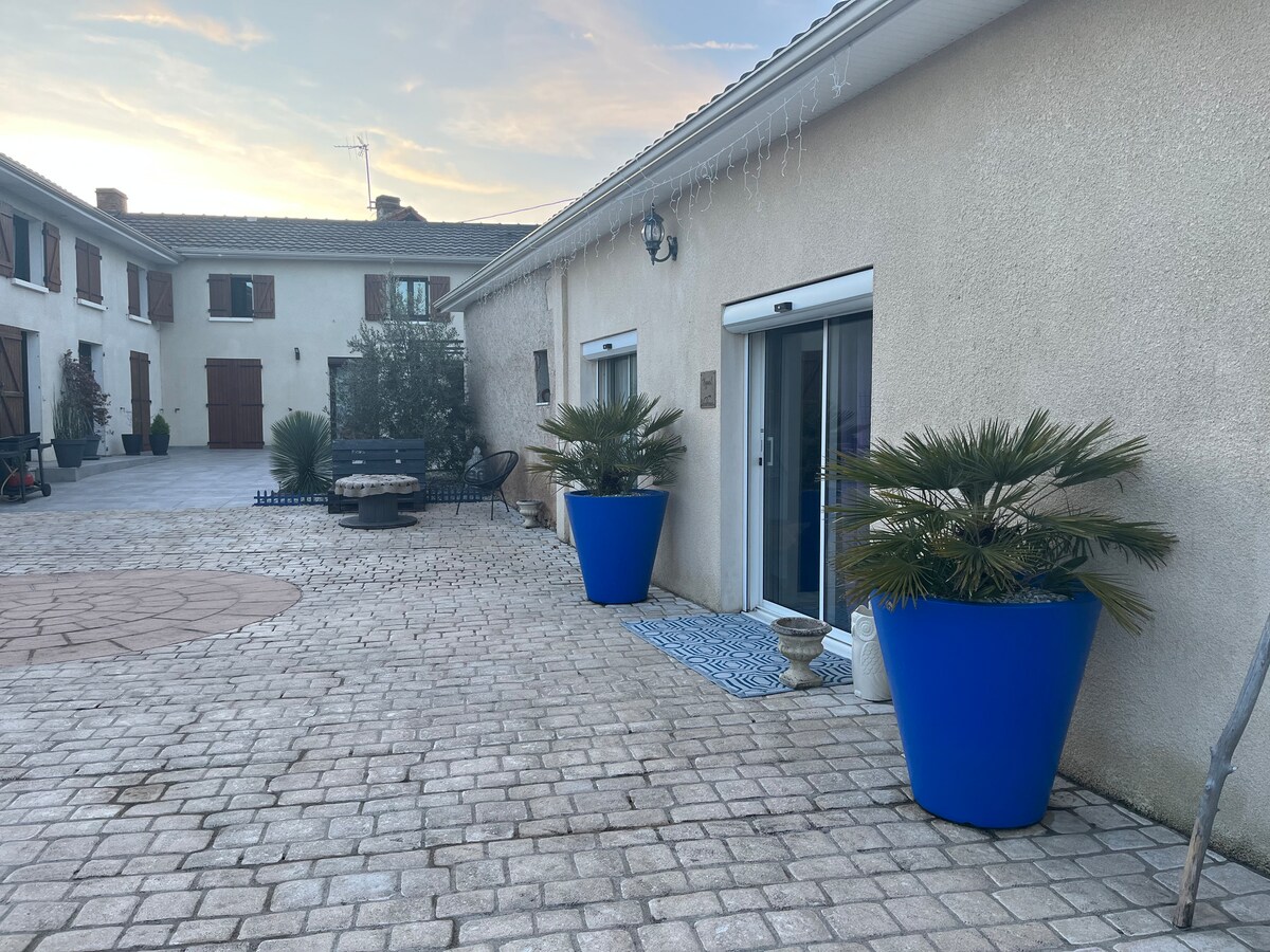 Tento útulný 54 m2 velký mezonetový domek klidné, nabízí relaxační pobyt pro celou rodinu, na dovolené, při projíždění, za prací, budeš v pohodě ✔️Wifi TV klimatizace 1 dvoulůžko, 3 jednolůžka Prostorná kuchyň, obývací pokoj, mezipatro ✔️Káva čaj sporák lednička ✔️Ručníky jsou součástí balení Nacházíme se 8 min od futuroscope Poblíž Poitiers Prostorná zahrada s relaxačním koutkem, hřištěm na pétanque Společný dvorek pro parkování Bezpečné a uzamčené místo ✔️krabice
