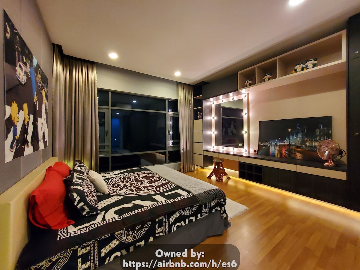 Okouzlující apartmán se službami s nádherným výhledem na Sunway Pyramid, pohodlně v blízkosti Sunway Pyramid Hotel, Sunway Convention Centre, Sunway Lagoon a BRT Sunway Line. Užij si snadný přístup k nákupům, restauracím a veřejné dopravě. Tato plně zařízená nabídka zahrnuje 1 parkoviště, 100mbps Wi-Fi, 1 manželskou postel Queen, 2 jednolůžka, 1 rozkládací pohovku, 32palcovou LED televizi s Netflixem, lednici, pračku se sušičkou, základní vybavení kuchyně, sdílenou posilovnu a bazén.