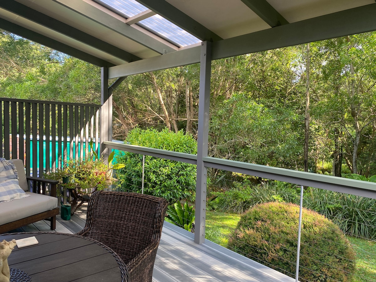 Lie back and relax in this gorgeous retreat. You'll find all the comforts of lush accommodation in this modern and private building with views of trees from every window. The mini plunge pool is heated for year round use. Stroll three blocks down to our local patrolled beach at Flynns for a swim at a patrolled beach. A choice of places to eat or socialise are all within easy walking distance. Chill on the deck overlooking Macquarie Nature Reserve and Wrights Creek. Superb!
