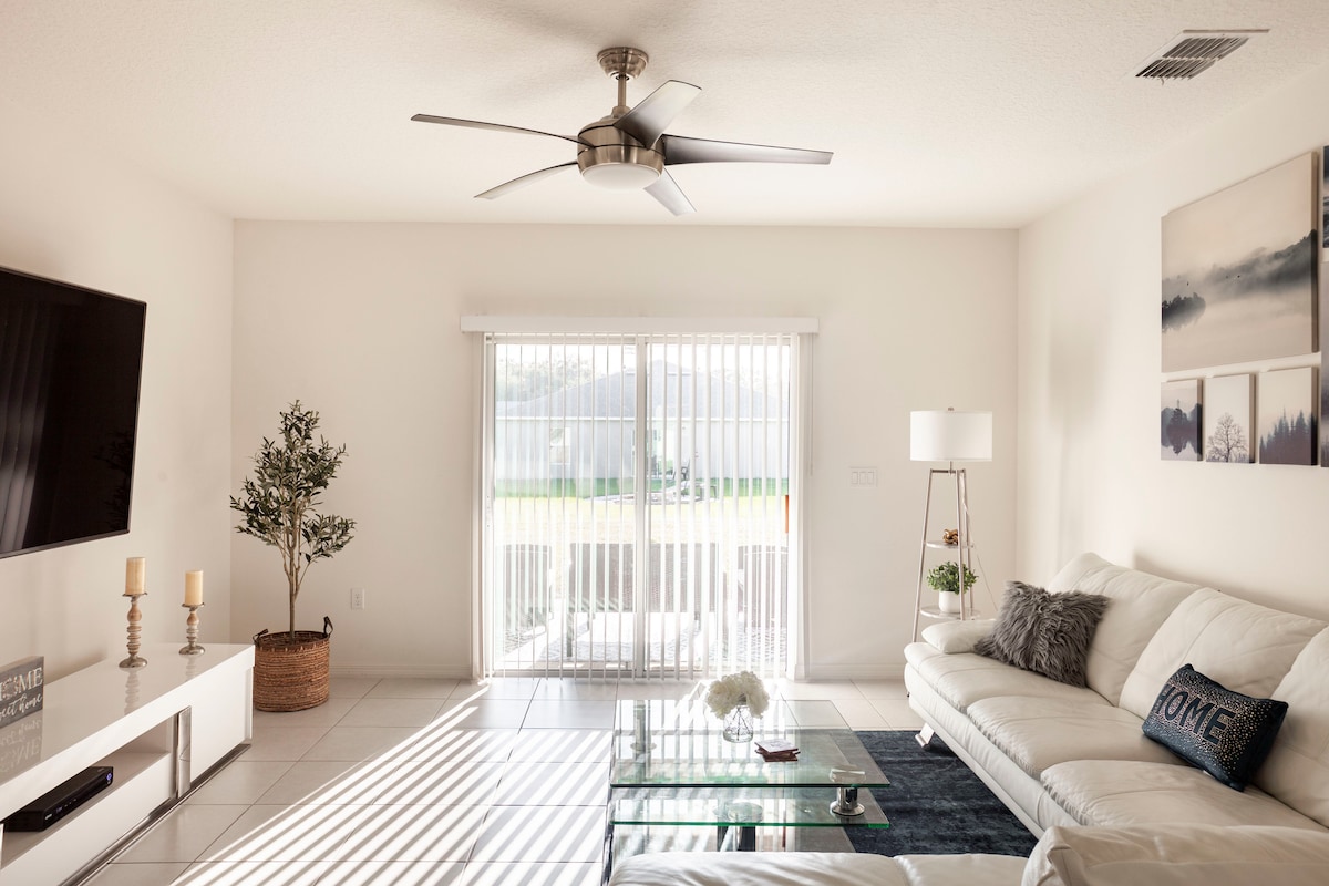 Welcome to The Palm — a fire pit oasis near Jensen Beach. Unwind in the private backyard, relax in the screened patio with smart TV and hanging chairs, or cook in the fully stocked modern kitchen. Just minutes from Jensen Beach, Stuart Beach, and historic downtown Stuart, this home is perfect for families, couples, and remote workers. Enjoy fast Wi-Fi, memory-foam beds, and kid-friendly extras like a pack & play and changing station.