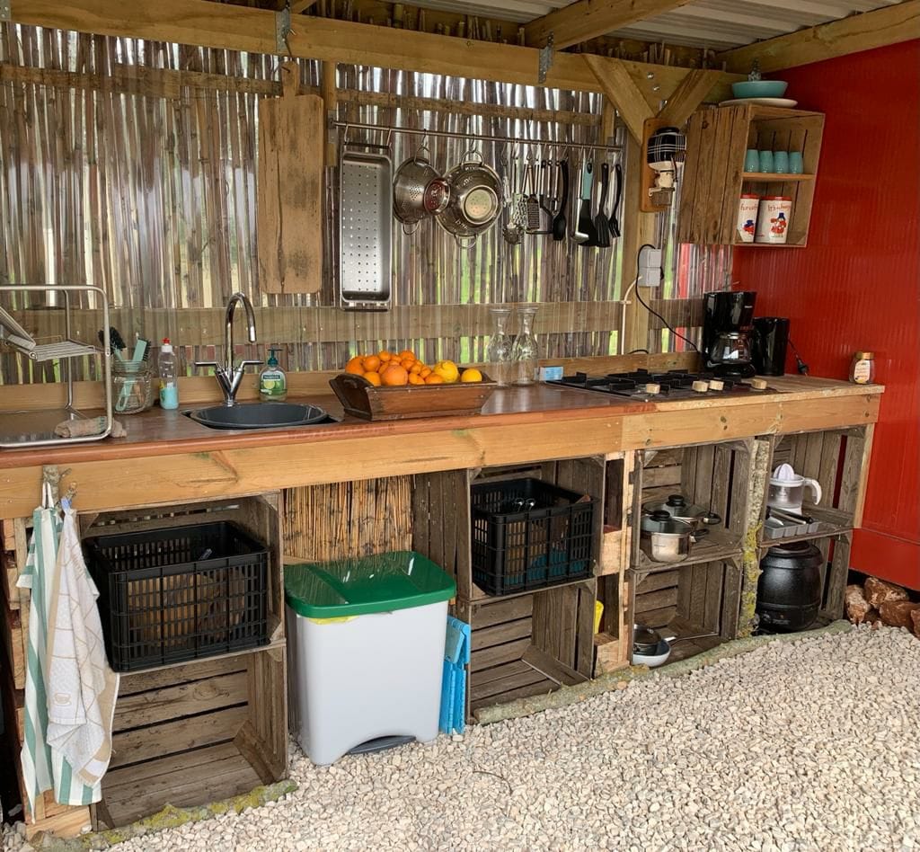 Jednoduché a lehké ubytování, ale se všemi vymoženostmi, které potřebuješ. Když jsi obklopen/a akátovými stromy, usínání nikdy nebylo tak skvělé. Užij si svůj vlastní prostor venku, kde můžeš začít ráno nebo usrkávat svůj oblíbený drink a užít si západ slunce. Venkovní zařízení bylo vybudováno s láskou a jednoduchostí s respektem k přírodě. Naše kuchyně tě očekává, abys vyjádřil/a své vaření a podělil/a se o příjemné chvíle se všemi týmy a ostatními hosty. Vynikající snídaně v ceně!