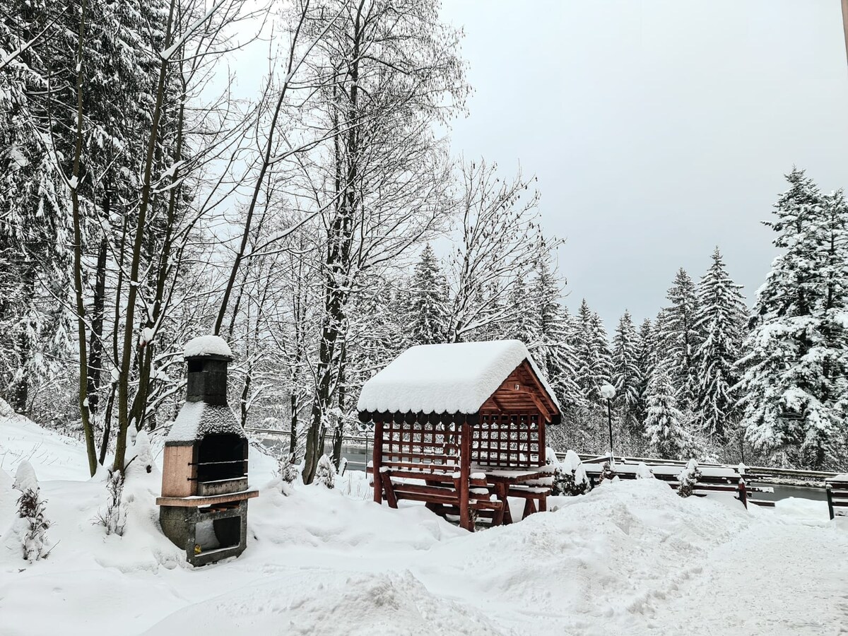 Our chalet offers a relaxing and comfortable getaway. The space features a cozy living room, a bedroom, a bathroom, and a fully equipped kitchenette. Step outside to the terrace, where you can enjoy beautiful views of the mountains. Perfect for couples or small families, this charming chalet provides a peaceful escape with easy access to nature and adventure.