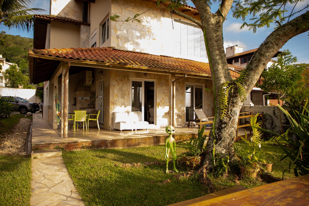 Casinha estilo rústico em frente a praia de Ponta das Canas na parte mais isolada. Mesmo com lotação máxima na ilha aqui é um cantinho reservado. Para chegar a praia em frente é possivel de duas formas pela rua (300m) ou pela lagoa (água salgada), quando está baixa molhando apenas até o joelho com uma paisagem incrível, cheia de gaivotas. Ideal para quem curte a natureza. Janela do quarto com linda vista para lagoa e mar. Aqui você pode também desfrutar o jardim fazer churrasco.