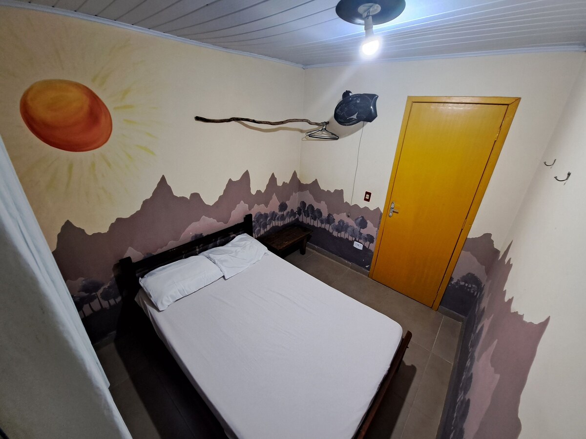 Temos uma casinha simples e bem localizada na Praia de Encantadas. Contendo quarto com televisão e ar-condicionado + banheiro comum + espaço para realizar as refeições (pia, fogão elétrico, geladeira e itens de cozinha). O terreno é privativo, está há 150mts do píer de embarque/desembarque e da praia principal; próximo a mercados, padaria, restaurantes e outros comércios. **Não fornecemos mantimentos e itens de uso pessoal como: toalhas de banho, sabonetes, creme dental, etc.