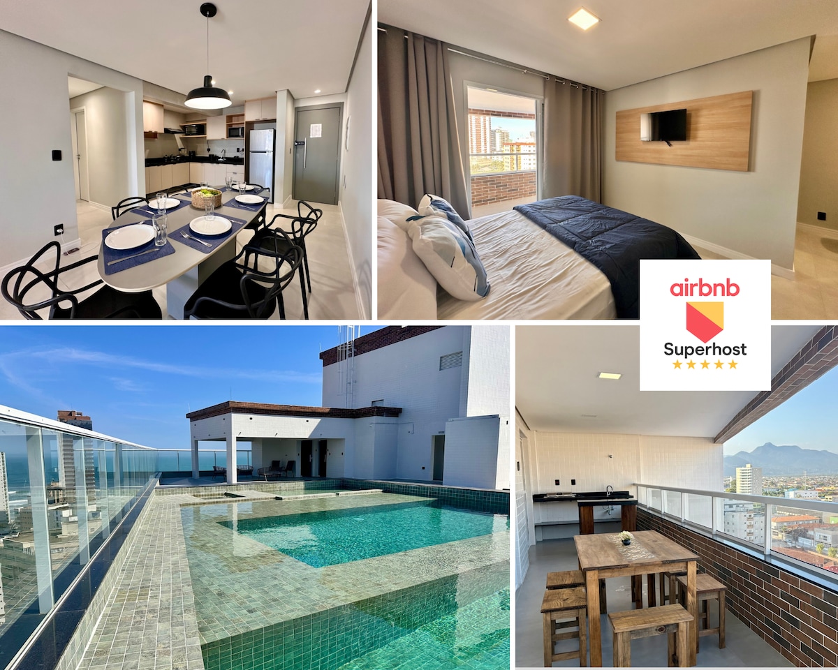 Apartamento novo na Praia Grande, em frente ao mar, com piscinas e para até 6 pessoas. Localizado em um dos melhores bairros da baixada santista, Vila Caiçara, piscinas adulto e infantil, sacada no 7° andar frente ao mar e com uma vista maravilhosa, Wi-Fi, sala, cozinha, louça completa, forno, microondas, banheiro, quarto, portaria 24h, garagem coberta, elevadores e total acesso para cadeirantes. *Trabalhamos com check-in e check-out flexíveis para aproveitar mais! Aguardamos sua reserva!