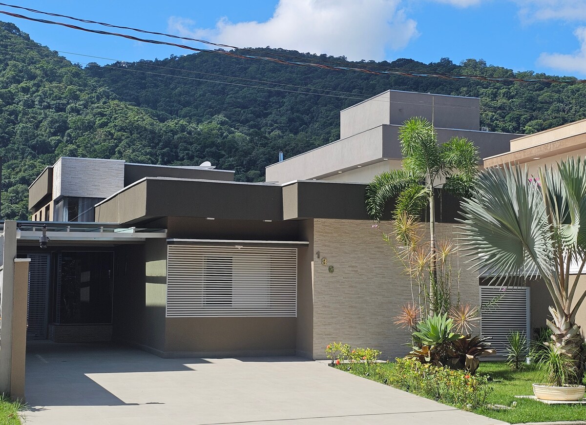 Jednopatrový dům v uzavřeném komplexu s 24hodinovou ostrahou a velkým komfortem až pro 8 osob, 4 ložnice, dvě s koupelnou a dvě jednolůžkové ložnice; obývací pokoj/TV, jídelna spojená s velkým gurmánským balkonem s grilem, houpací sítě, bazén s integrovanou vířivkou a saunou. Naproti domu se nachází zelená plocha/náměstí se sportovním/tenisovým hřištěm, turistickou stezkou, dětským hřištěm a rozmanitou krajinou. V pozadí je krásný výhled na Serra do Mar!