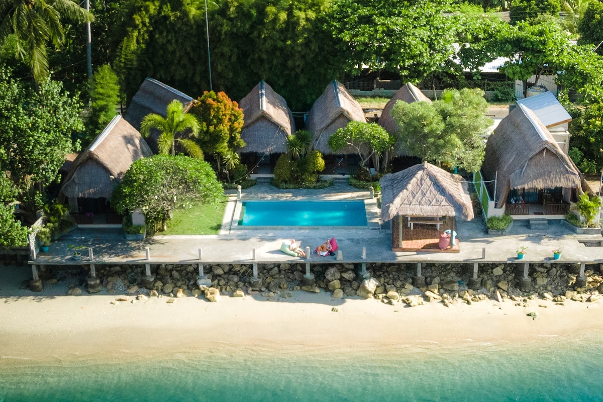 Burudika Bungalows is a collection of four stunning villas nestled amongst thriving tropical gardens. Each villa has a luxurious supreme-king bed, outside bathrooms, and stunning grass roofs. Booking all of the villas for a group of 8 (four couples) is the perfect way to experience the property. Within the grounds of Burudika, it is an oasis. With lush green grass, a swimming pool, a tropical garden, and even a fire pit. It's the perfect place to come and take a breath with friends.