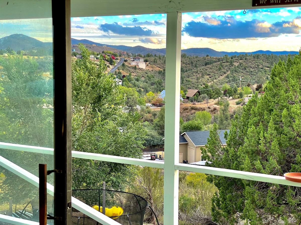 Krásná terasa s výhledem na potok. Dům má 960 čtverečních stop, 3 ložnice, 2 koupelny. Centrálně umístěný mezi Prescottem a Prescott Valley - 11 minut od historického centra Prescottu, 7 minut od Prescott Valley. Krásné soukromé venkovní posezení, propanový gril. Interiér byl nově zrekonstruován. Zahrnuje rychlé Wi-Fi, 2 chytré televizory, plně vybavenou kuchyni, 2 koupelny, šatnu. Jen pár minut od Granite Dell, Lynx Lake, Watson Lake. Káva a čaj zdarma. Domácí mazlíčci jsou vítáni.