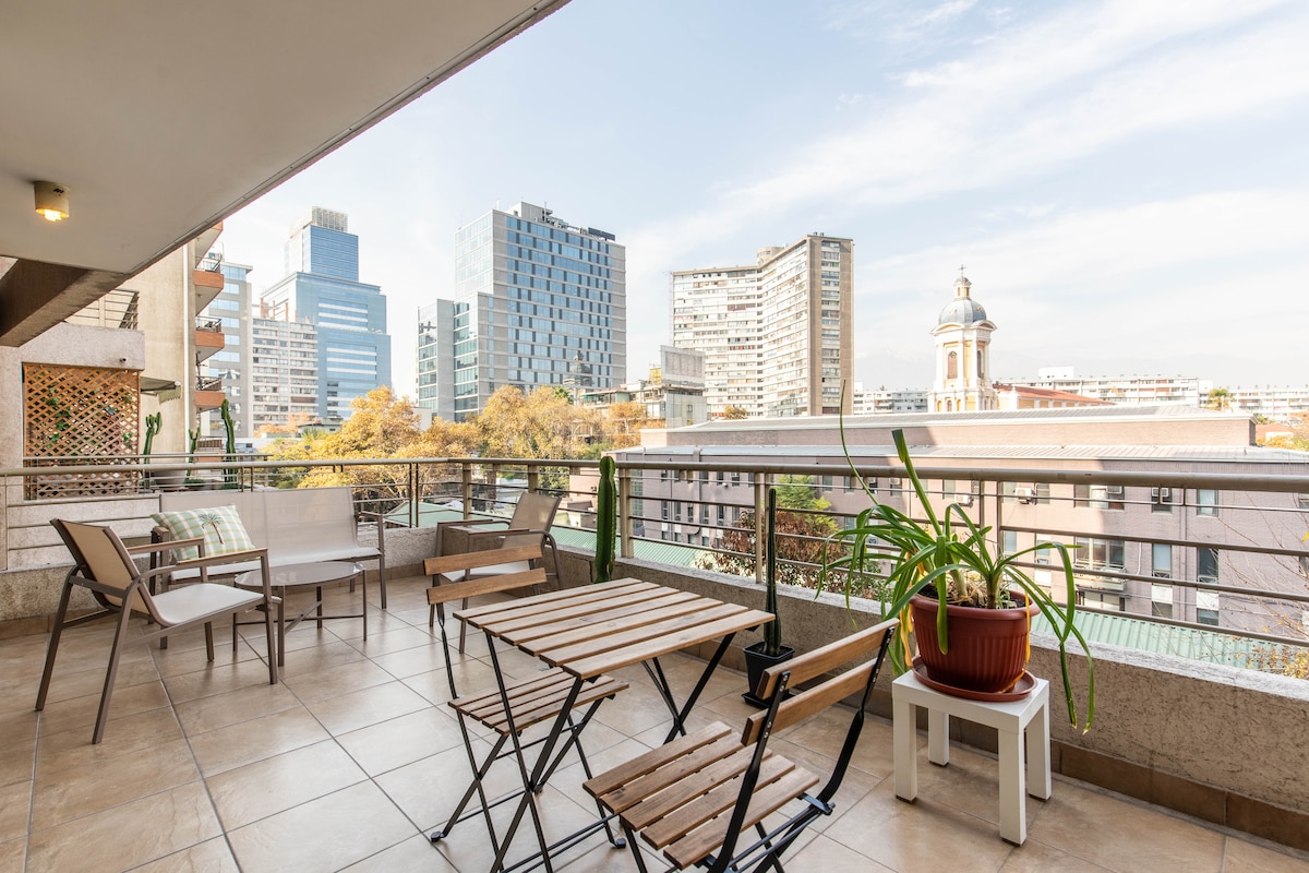 This apartment is ideal for relaxing and enjoying the city. It's centrally located, between the Santiago Centro and Providencia districts, one of the best locations in the city. It offers beautiful views of San Cristóbal Hill and the Sky Costanera. It's just a 3-minute walk from the metro and buses. Includes: Free Wi-Fi, a fully equipped kitchen, sheets and towels included, a large bed with a large Smart TV. Self-service entrance with a key, allowing you to arrive at any time.