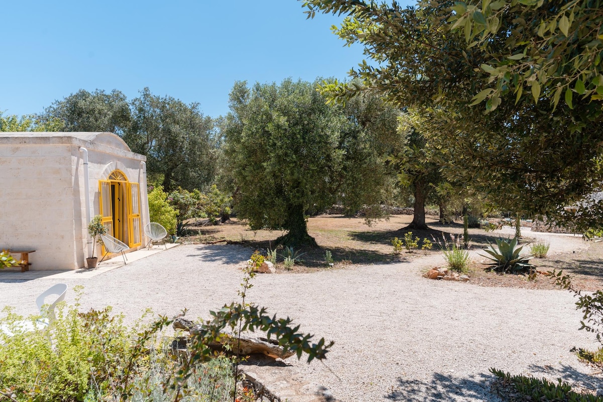 Kouzlo místa je bezkonkurenční: budova má výhled na terasovitou zahradu charakterizovanou typickými suchými kamennými stěnami, za nimiž se otevírá, pokud oko vidí, na ploše asi 6 000 metrů čtverečních exkluzivního významu domu, údolí nádherných staletých olivovníků na červené zemi. Citrusový háj, sad, velké plochy středomořského křoviny, mezi nimiž mnoho rostlin a aromatických bylin najde prostor, otevřené obrazy, v bouři barev a vůní nekontaminované přírody, které osvětlují oči a rozjasňují mysl. Typické apulské ovoce a zelenina, zcela ekologické, jsou k dispozici pro hosty.