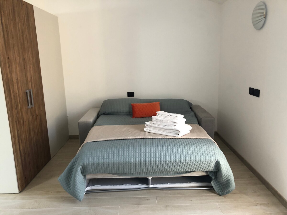 Cozy ground-floor studio in the quiet Chievo district of Verona. Features a fully equipped kitchen, double bed, and modern bathroom. Just 100 m from the bus stop to the city center (30 min). By car, the historic center, Lake Garda, and Gardaland (20 min) are easily reachable. Ideal for those looking for comfort and convenience to explore Verona and its surroundings.