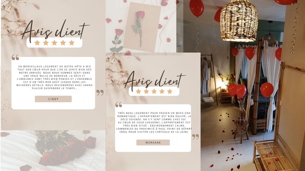 Bulle d'amour - Love Room à Cour Cheverny Évadez-vous dans un cocon romantique à Cour Cheverny ! Venez vou détendre avec la baignoire balnéo spa, d'un lit queen-size et d'un vidéoprojecteur 4K pour des soirées cinéma intimes. Fauteuil tantra, ambiance sur-mesure (roses, champagne) et cuisine équipée. À 1min du château de Cheverny et 15 minutes de Chambord, parking gratuit, check-in autonome. Expérience folle et unique à vivre maintenant Retrouvez nous sur CintaBali love room