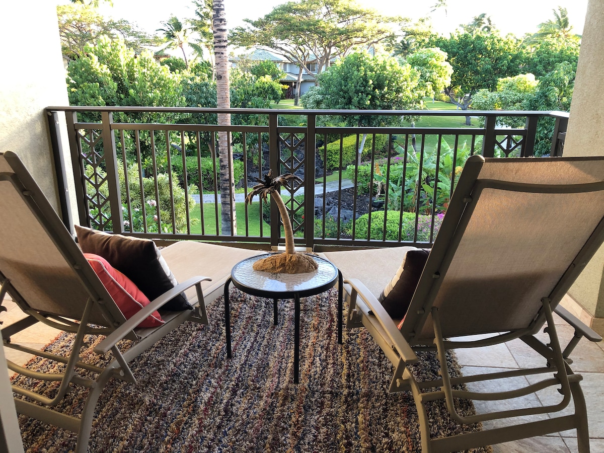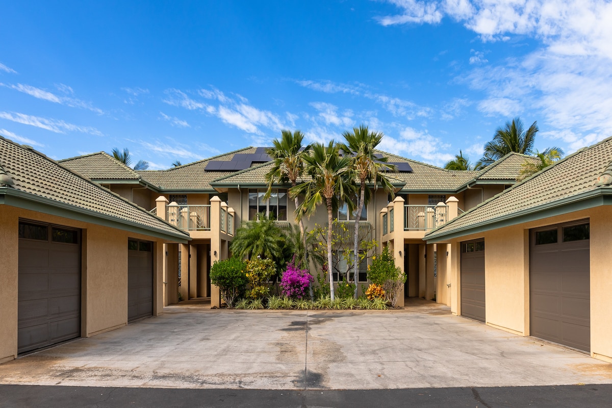 Předělaný byt v nejvyšším patře, 2 ložnice/2 koupelny, 10–15 minut od nejlepších pláží, hlavní ložnice s ergonomickou manželskou postelí, vlastní koupelna, klimatizace. 2. ložnice se 2 jednolůžky a klimatizací. Odpočiň si na verandě s výhledem na oceán, hory a Maui, sleduj divoké papoušky nad golfovým hřištěm. Užij si plně zásobenou kuchyni, pračku/sušičku v jednotce, streamování na chytré televizi nebo možnosti stravování a nakupování jen pár minut odtud. Hosté mají přístup k bazénu, vířivce, grilu a posilovně, a navíc mohou využít slevy na golf, bazén a tenis ve Waikoloa Village Assn.