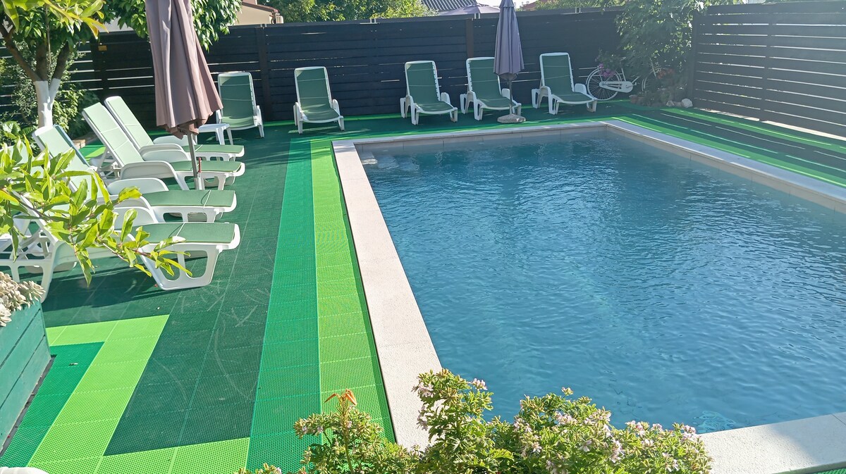 Vítejte v našem apartmánu Villa v Pule! Náš apartmán o rozloze 120 m² se nachází v klidné oblasti Marina Veruda, přímo u vjezdu na nádherný poloostrov Verudela. Je to jen kousek od nejlepších pláží v Pule, takže je to ideální místo k relaxaci a odpočinku, a zároveň je to blízko všeho, co potřebuješ prozkoumat. Naši hosté mají přístup k velkému společnému bazénu o rozloze 32 m², kolem kterého je spousta lehátek, kde si můžete vychutnat sluneční koupel. Najdeš zde klidný venkovní prostor, kde si můžeš odpočinout a užít si po dni stráveném u moře. A co je na naší vile nejlepší? Všechno je v docházkové vzdálenosti. Supermarket Grga, kde najdete vše potřebné, je jen 50 metrů daleko. Nejbližší pláž je jen 450 metrů od vily, a pokud chcete prozkoumat Pulu, turistický úřad je jen 150 metrů daleko. Zastávka autobusu, který vás zaveze do centra města, je hned za rohem – 200 metrů daleko, jen jednu minutu chůze. Naše vila je navržena tak, abyste se cítili jako doma. Byt je moderní, svěží a plně klimatizovaný pro vaše pohodlí. Uvnitř najdete vše, co potřebujete pro bezstarostný pobyt, od plně vybavené kuchyně až po vysokorychlostní Wi-Fi, útulné ložnice a čerstvé ložní prádlo a ručníky – vše, co potřebujete si přinést, jsou vaše osobní věci! :) Naše oblíbené místo? Náš gril a zahrada v džungli. Po dni plném objevování nebo plavání je naše grilovací místo v džungli ideálním místem k odpočinku. Dejte si drink, vychutnejte si pohodové jídlo, nebo se prostě usaďte a opalujte se v bazénu. Ať už jsi tady, abys prozkoumal/a bohatou historii Puly, nasál/a středomořské slunce, nebo jen relaxoval/a na pláži, naše vila je ideální základnou. Chceme mít jistotu, že máš vše, co potřebuješ, takže pokud budeš mít nějaké dotazy nebo budeš potřebovat tipy na nejlepší místa, kde se najíst, aktivity nebo věci, které můžeš v Pule podniknout, dej nám vědět. Vždy rádi pomůžeme! Já a moje matka budeme vašimi hostiteli. Jsme zde, abychom ti pomohli se vším, co budeš potřebovat, a doufáme, že během pobytu zažiješ skutečný středomořský životní styl.
