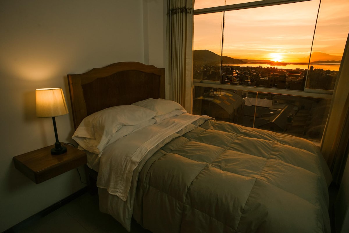 Útulný miniapartmán v centru města Puno, pouhé 2 bloky od náměstí Plaza de Armas, blízko restaurací, cestovních kanceláří a obchodů. Skvělé pro sólo cestovatele nebo páry, které chtějí prozkoumat město a jezero Titicaca pěšky. Najdeš tu manželskou postel, vlastní koupelnu, vybavenou kuchyň, rychlé Wi-Fi, televizi a teplou vodu 24 hodin denně. Nachází se v 7. patře s točivým schodištěm, s přístupem na střechu a panoramatickým výhledem na město. Abychom ti usnadnili pobyt, můžeme ti zajistit prohlídky a služby vyzvednutí.