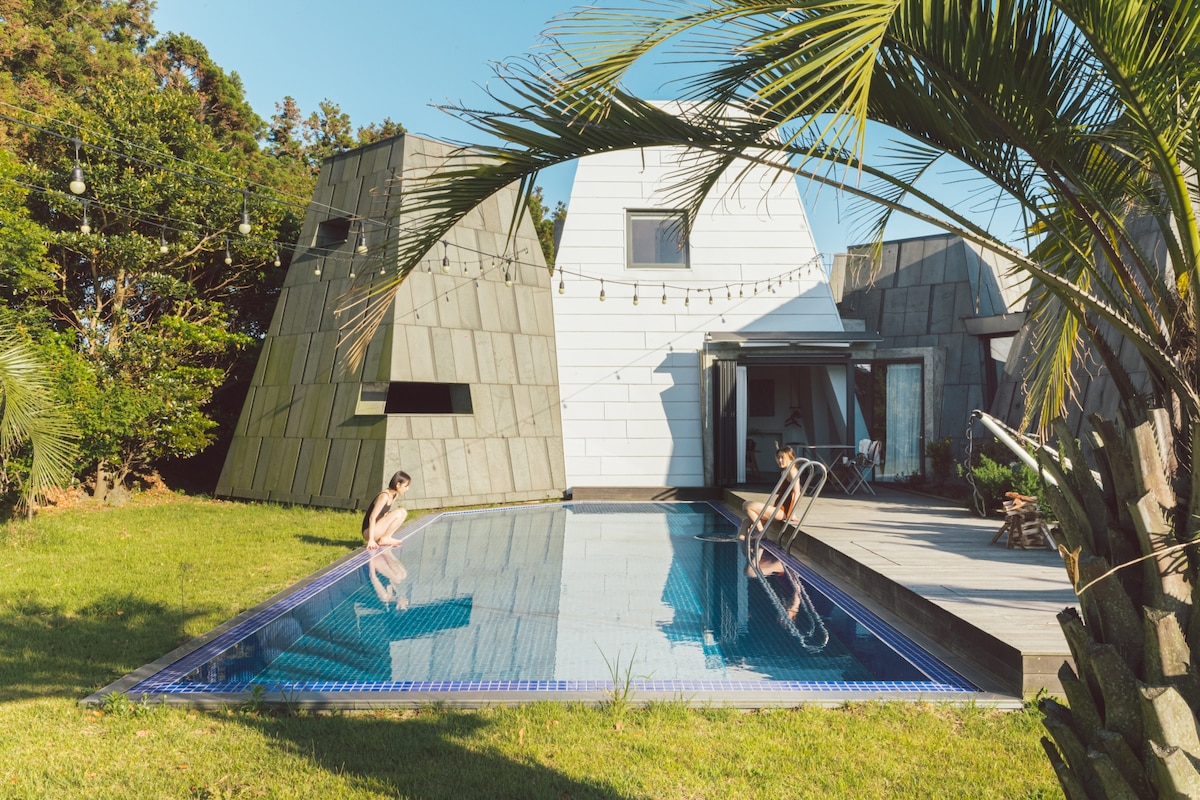 The single-family building has one bedroom, living room, kitchen, bathroom, and parking in front of the entrance. There is a front yard with a barbecue, and a terrace with a lawn at the back. The exterior with Spanish roof tiles and bright walls creates a warm atmosphere as if you were in the Mediterranean, and the interior consists of a cafe-style living room with wide open windows. Enjoy a quiet and peaceful atmosphere located in a remote citrus farming area in Namwon-eup, in Seogwipo City.